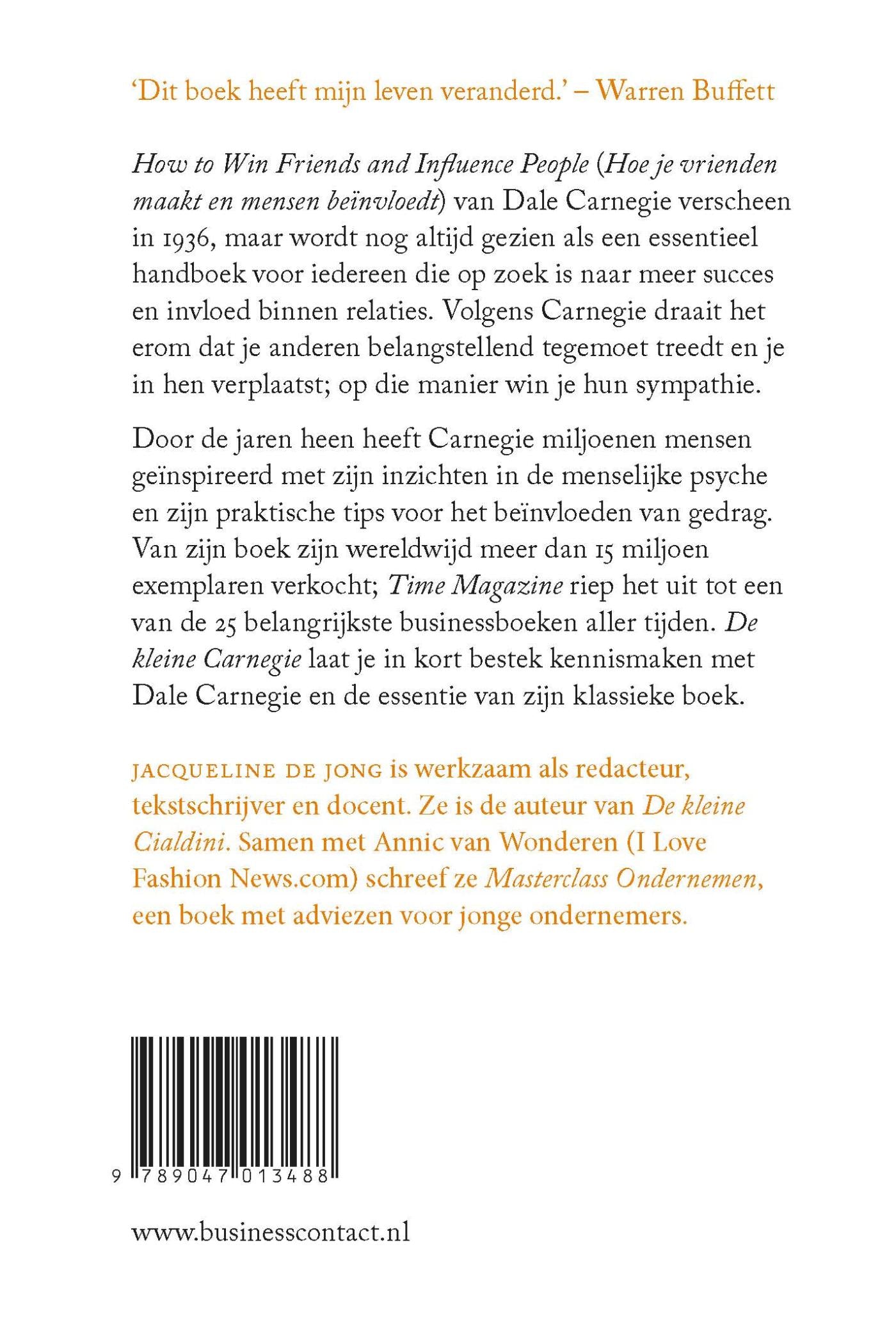 Jacqueline de Jong laat je in 'De kleine Carnegie' in kort bestek kennismaken met Dale Carnegie en de essentie van zijn klassieke boek 'How to Win Friends and Influence People' (Hoe je vrienden maakt en mensen beïnvloedt).Het boek verscheen in 1936, maar wordt nog altijd gezien als een essentieel handboek voor iedereen die op zoek is naar meer succes en invloed binnen relaties. Volgens Carnegie draait het erom dat je anderen belangstellend tegemoet treedt en je in hen verplaatst; op die manier win je hun sympathie. Daarvoor geeft hij adviezen als: toon respect voor andermans ideeën, laat de ander het meest aan het woord en wees oprecht geïnteresseerd.