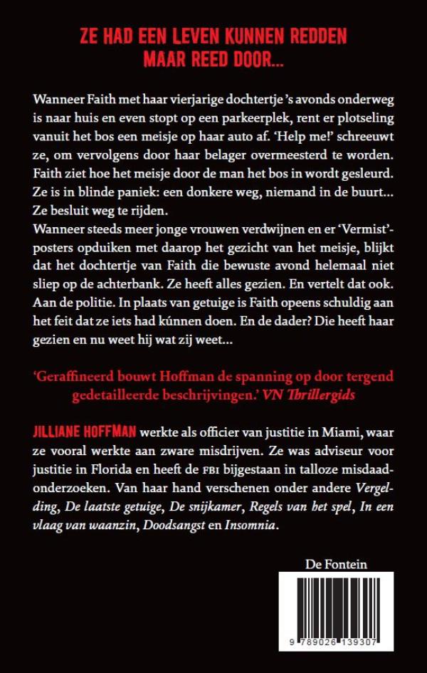 Wanneer steeds meer jonge vrouwen verdwijnen en er ‘Vermist’-posters opduiken met daarop het gezicht van het meisje, blijkt dat Faith’s dochtertje die bewuste avond helemaal niet sliep op de achterbank. Ze heeft alles gezien. En vertelt dat ook. Aan de politie. In plaats van getuige is Faith opeens schuldig aan het feit dat ze iets had kúnnen doen. En de dader? Die heeft haar misschien wel gezien en nu hij weet wat zij weet…