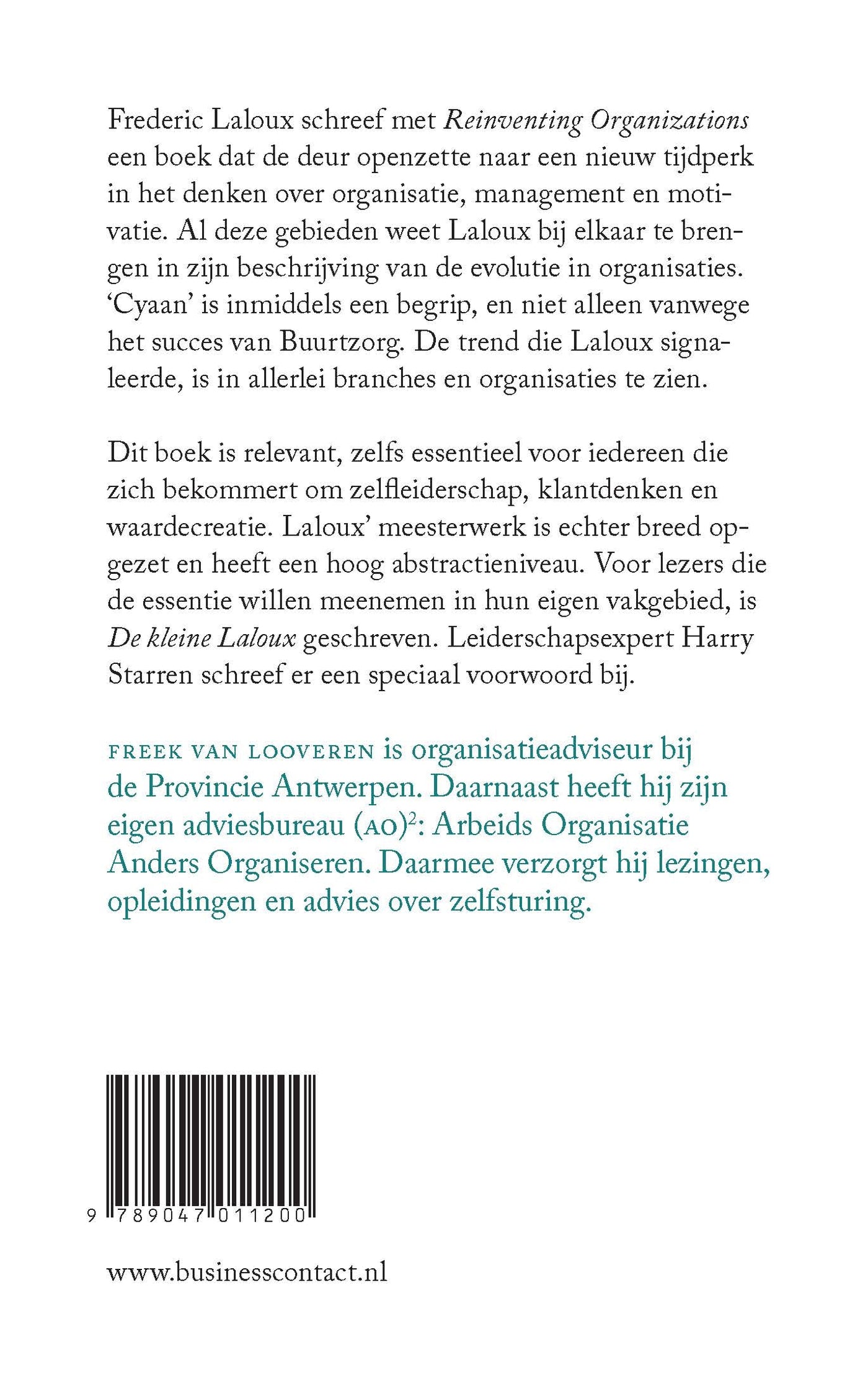 Dit boek is relevant, zelfs essentieel voor iedereen die zich bekommert om zelfleiderschap, klantdenken en waardecreatie. Laloux’ meesterwerk is echter breed opgezet en heeft een hoog abstractieniveau. Voor lezers die de essentie willen meenemen in hun eigen vakgebied, is ‘De kleine Laloux’ geschreven. Leiderschapsexpert Harry Starren schreef er een speciaal voorwoord bij.