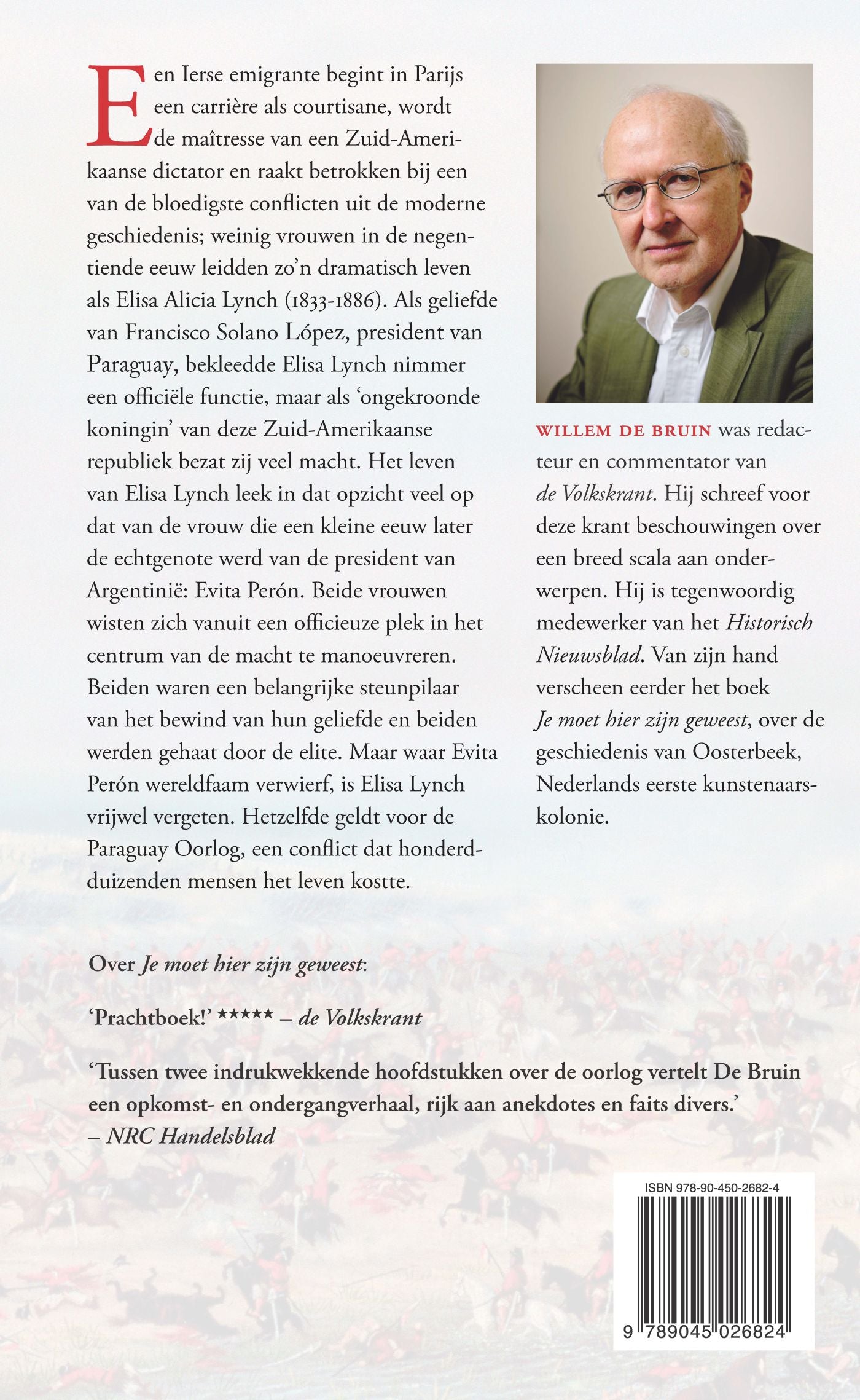 In De koningin van Paraguay vertelt Willem de Bruin het bijzondere en dramatische verhaal van de Ierse emigrante Elisa Alicia Lynch (1833-1886). In Parijs begon ze een carrière als courtisane, werd de maîtresse van een Zuid-Amerikaanse dictator en raakte betrokken bij een van de bloedigste conflicten uit de moderne geschiedenis. Als geliefde van Francisco Solano López, president van Paraguay, bekleedde Elisa Lynch nimmer een officiële functie, maar als ‘ongekroonde koningin’ van deze Zuid-Amerikaanse republiek bezat zij veel macht. Het leven van Elisa Lynch leek in dat opzicht veel op dat van de vrouw die een kleine eeuw later de echtgenote werd van de president van Argentinië: Evita Perón. Beide vrouwen wisten zich vanuit een officieuze plek in het centrum van de macht te manoeuvreren. Beiden waren een belangrijke steunpilaar van het bewind van hun geliefde en beiden werden gehaat door de elite. Maar waar Evita Perón wereldfaam verwierf, is Elisa Lynch vrijwel vergeten. Hetzelfde geldt voor de Paraguay Oorlog, een conflict dat honderdduizenden mensen het leven kostte.