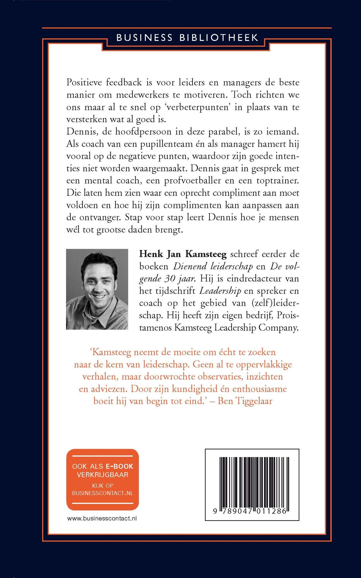 Positieve feedback is voor leiders en managers de beste manier om medewerkers te motiveren. Toch richten we ons maar al te snel op `verbeterpunten in plaats van te versterken wat al goed is. Dennis, de hoofdpersoon in deze parabel, is zo iemand. Als coach van een pupillenteam én als manager hamert hij vooral op de negatieve punten, waardoor zijn goede intenties op zijn werk en op het voetbalveld niet worden waargemaakt. Nadat een vriend hem daarop attent maakt, gaat Dennis in gesprek met een mental coach, een profvoetballer en een toptrainer. Die laten hem onder meer zien waar een oprecht compliment aan moet voldoen en hoe hij zijn complimenten kan aanpassen aan de ontvanger. Stap voor stap leert Dennis hoe je mensen wél tot grootse daden brengt.