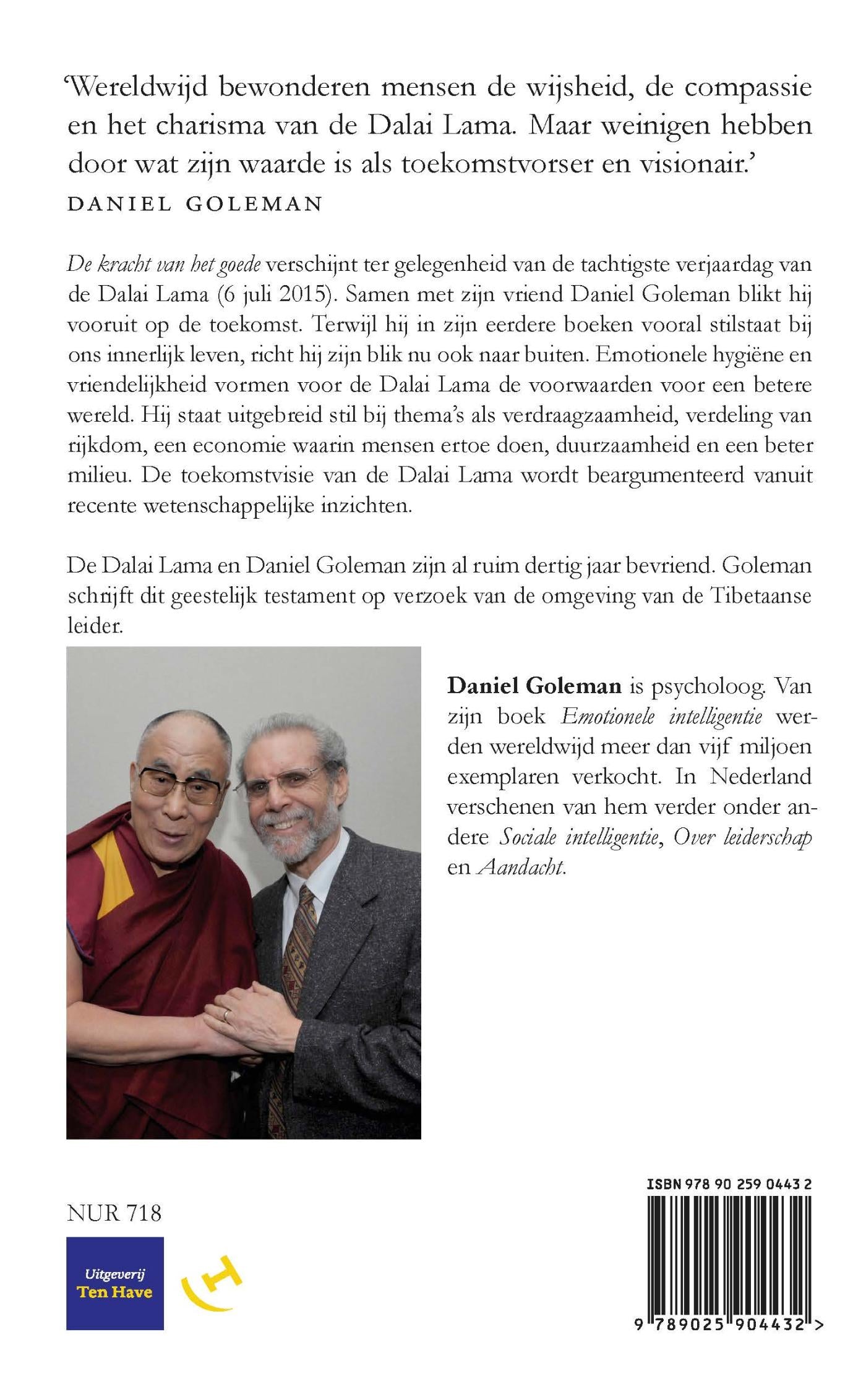 De tachtigste verjaardag van de Dalai Lama was een goede aanleiding voor deze bekendste boeddhist ter wereld om vooruit te blikken. Daniel Goleman, al ruim dertig jaar bevriend met de Dalai Lama, ging met hem in gesprek en tekende uit zijn mond een manifest voor de toekomst op. ‘De kracht van het goede’ is het geestelijk testament van de Dalai Lama. Aan de orde komen thema’s als verdeling van rijkdom, duurzaamheid, zelfbeheersing, positieve emoties en compassie.