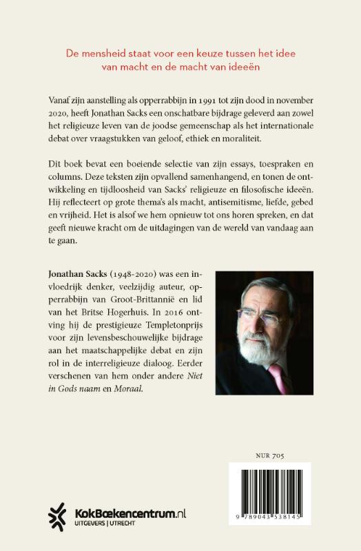 De kracht van ideeën van rabbijn Jonathan Sacks is een boeiende selectie van zijn essays, toespraken en columns. De verzamelde stukken van de rabbijn tonen met opvallende samenhang de ontwikkelende kracht van zijn religieuze en filosofische ideeën. Sacks reflecteert op grote thema’s als macht, antisemitisme, liefde, gebed en vrijheid. Deze woorden van wijsheid en geloof laten de tijdloze relevantie van Sacks’ lessen zien. Het is alsof we hem opnieuw tot ons horen spreken, wat ons nieuwe kracht geeft om de uitdagingen van de wereld van vandaag aan te gaan.