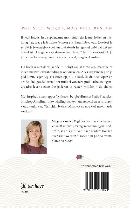Jij leeft intens. In de spaarzame momenten dat je met je benen omhoog ligt, vraag je je af hoe je meer rust kunt inbouwen. Hoe leef je zo dat je je energiek voelt en niet steeds het gevoel hebt dat het net teveel is. Hoe ga je van streven naar leven? In dit boek ontdek je jouw haalbare weg. Want wie veel werkt, mag veel rusten. Wanneer je de reis naar je hart maakt en kiest voor gezonde gewoontevorming rondom rust, schieten werkplezier en kwaliteit omhoog. Werkenden van wereldformaat gingen je daar al in voor en geven praktische handvatten voor iedereen die druk ervaart in zijn bestaan.