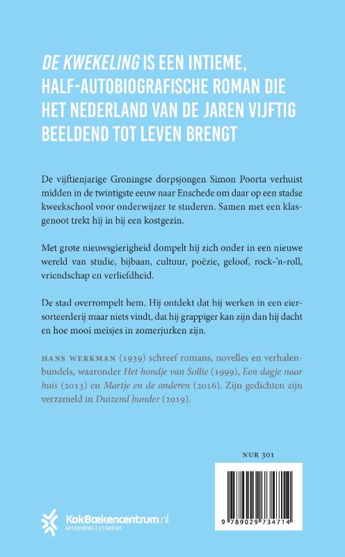 ‘De kwekeling’ van Hans Werkman is deels autobiografisch en geeft een helder tijdsbeeld van de jaren vijftig. De vijftienjarige Groningse dorpsjongen Simon Poorta verhuist midden in de twintigste eeuw naar Enschede om daar op een stadse kweekschool voor onderwijzer te studeren. Daar trekt hij in bij een kostgezin en komt hij samen te wonen met een klasgenoot. Ondertussen landt hij steeds meer op de kweekschool, ontdekt hij het stadse leven en komt hij erachter dat hij van literatuur en beeldende kunst houdt. Met grote nieuwsgierigheid dompelt hij zich onder in een nieuwe wereld van studie, cultuur, geloof, rock-‘n-roll, vriendschap, verliefdheid en seksualiteit.