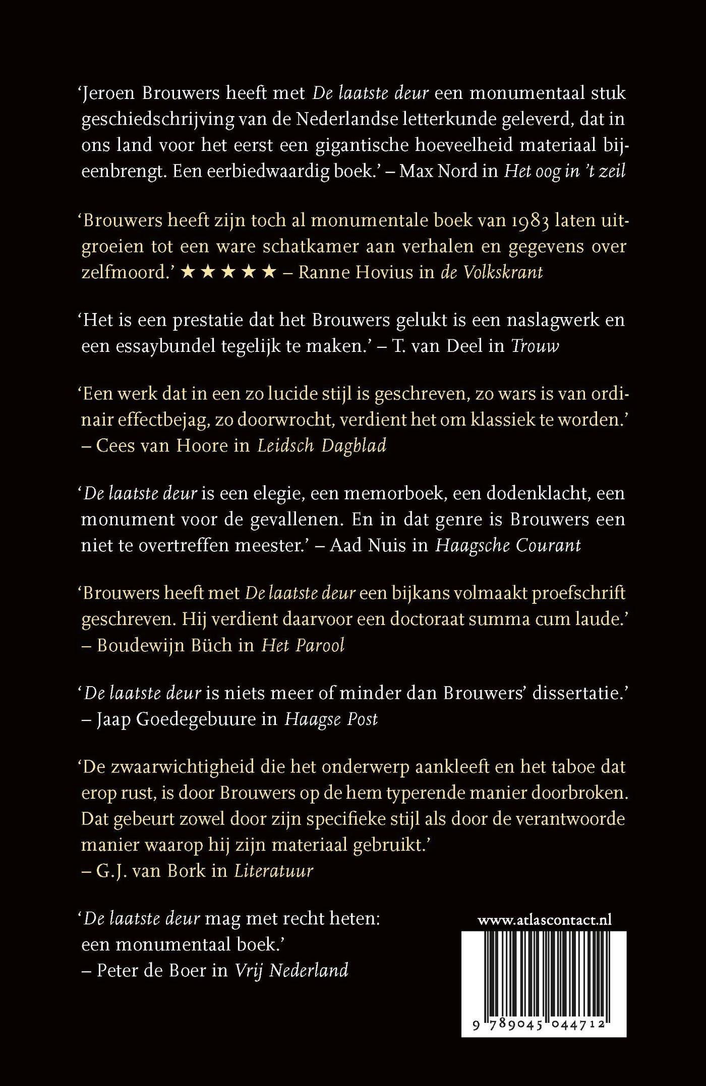 In ‘De laatste deur’ beschrijft Jeroen Brouwers de levensomstandigheden van Nederlandstalige auteurs en hoe die hen tot zelfmoord hebben aangezet, alsmede de indicaties daartoe die zij soms in hun werken hebben nagelaten. Welke invloed had bijvoorbeeld de Bijbel op de zelfmoord van schrijvers als François Haverschmidt, welke uitwerking hadden politiek en wereldgeschiedenis op de laatste dagen van Menno ter Braak? Er zijn perioden van zelfmoordgolven in de schrijverswereld, zoals in het laatste kwart van de jongste eeuw: Halbo C. Kool, Jan Emmens, Jan Arends, Jotie T’Hooft, nog anderen. En in de eerste jaren van de eenentwintigste eeuw de zelf veroorzaakte dood van Adriaan Venema, Anil Ramdas, Nanne Tepper, Joost Zwagerman en opnieuw tal van bekende en minder bekende anderen. Kortom, ‘De laatste deur’ is een literaire geschiedenis van zelfmoord, geschreven met empathie en betrokkenheid in een nieuwe, ingrijpend herziene en geactualiseerde editie.
