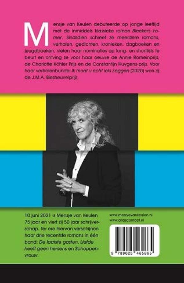 ‘De laatste gasten’, ‘Liefde heeft geen hersens’ en ‘Schoppenvrouw’, de drie recentste romans van Mensje van Keulen, verschijnen in één band ter ere van haar 75e verjaardag en haar 50 jaar schrijverschap.