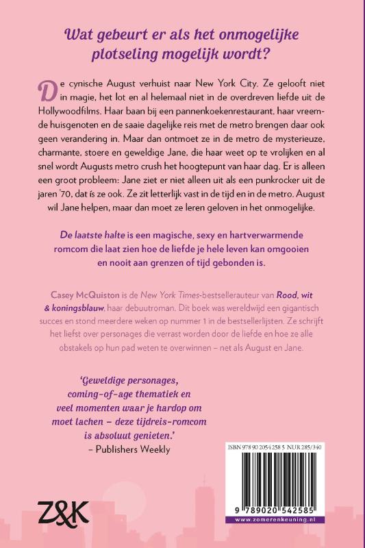 'De laatste halte' van bestsellerauteur Casey McQuiston gaat over de cynische August, die naar New York City verhuist. Ze gelooft niet in magie, het lot en de overdreven liefde uit de films. Maar dan ontmoet ze een geweldig meisje in de trein. De mysterieuze en charmante Jane weet August op te vrolijken. Er is alleen één groot probleem: Jane ziet er niet alleen uit als een rocker uit de jaren ’70, dat ís ze ook. Jane zit al jaren vast in de trein. August wil haar helpen, maar dan moet ze wel leren geloven in het onmogelijke. 'De laatste halte' van Casey McQuiston is een unieke roman met humor, romance én tijdreizen. Eerder verscheen van McQuiston de populaire rom-com 'Rood, wit & koningsblauw'.