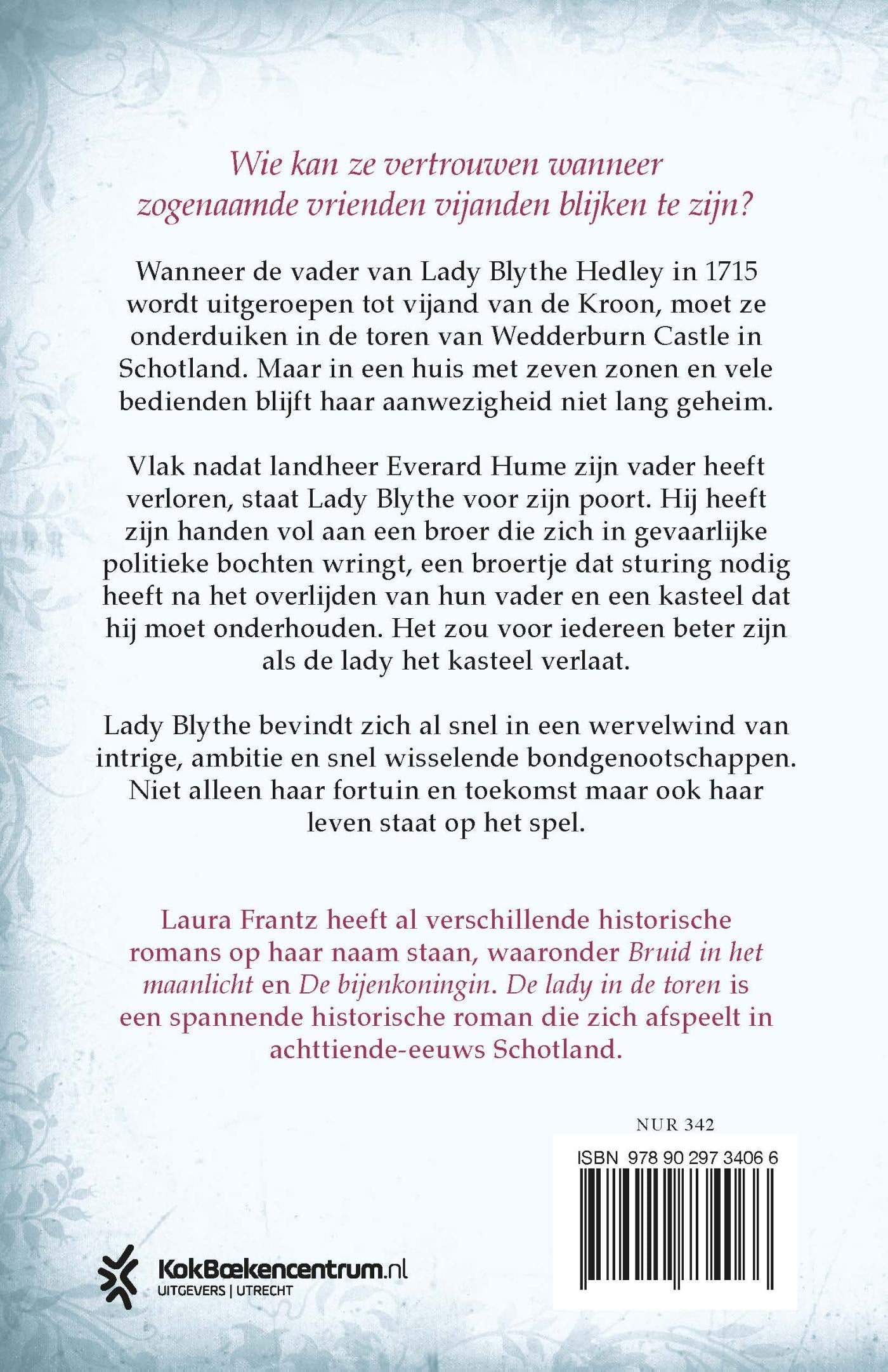 In ‘De lady in de toren’ van Laura Frantz moet lady Blythe Hedley plotseling vluchten wanneer haar vader wordt uitgeroepen tot vijand van de kroon. Ze komt als onderduiker terecht in de toren van Wedderburn Castle in Schotland. Maar in een huis met zeven zonen en vele bedienden blijft haar aanwezigheid niet lang geheim.