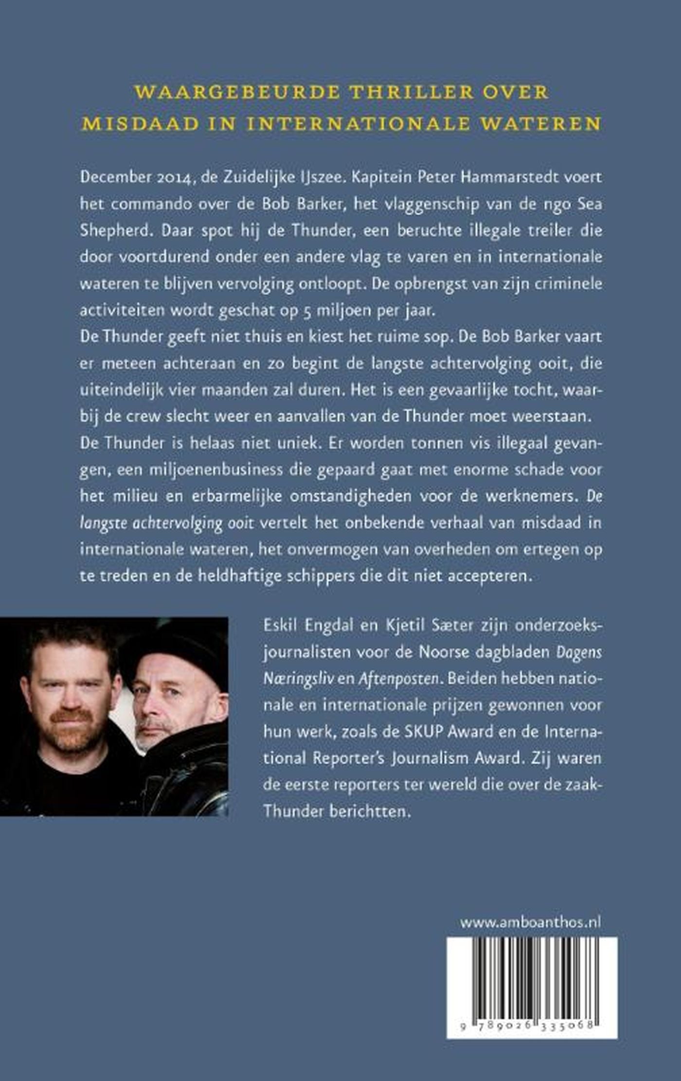 Zo begint de langste achtervolging ter wereld. Vier maanden lang volgen Hammarstedt en zijn bemanning de misdadigers, terwijl ze steeds de dichtstbijzijnde autoriteiten op de hoogte brengen van hun locatie. Het is een gevaarlijke tocht, waarin de crew slecht weer en aanvallen van de Thunder moeten weerstaan. De Thunder is helaas niet uniek. Er worden tonnen vis illegaal gevangen op de zeeën van de wereld, een miljoenenbusiness die gepaard gaat met enorme schade voor het milieu en erbarmelijke omstandigheden voor de werknemers. De langste achtervolging ooit vertelt het onbekende verhaal van misdaad in internationale wateren, het onvermogen van overheden om op te treden en de heldhaftige schippers die dit niet willen accepteren.