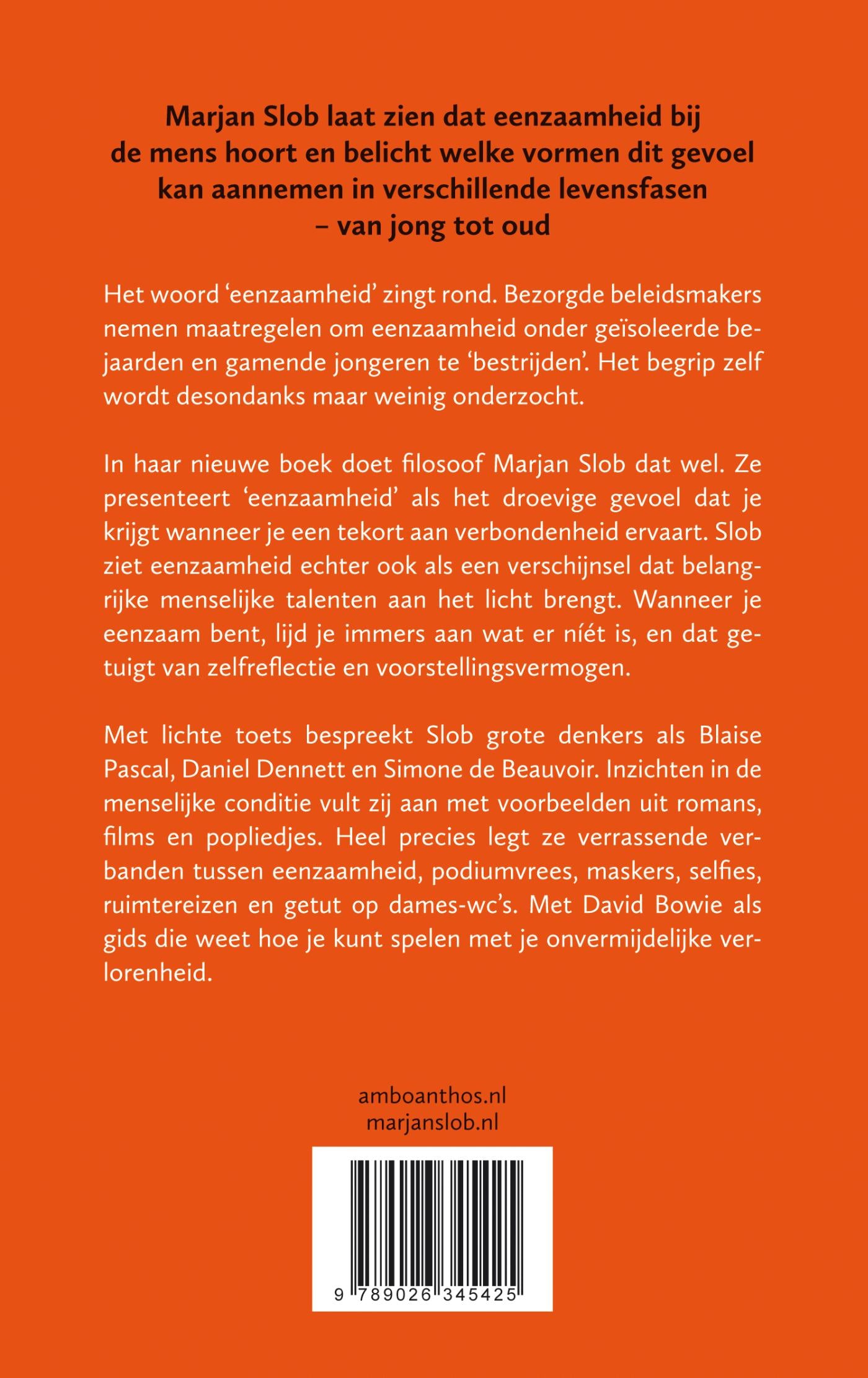 Met lichte toets bespreekt Slob grote denkers als Blaise Pascal, Daniel Dennett en Simone de Beauvoir. Inzichten in de menselijke conditie vult zij aan met voorbeelden uit romans, films en popliedjes. Heel precies legt ze verrassende verbanden tussen eenzaamheid, podiumvrees, maskers, selfies, ruimtereizen en getut op dames-wc's. Met David Bowie als gids die weet hoe je kunt spelen met je onvermijdelijke verlorenheid.