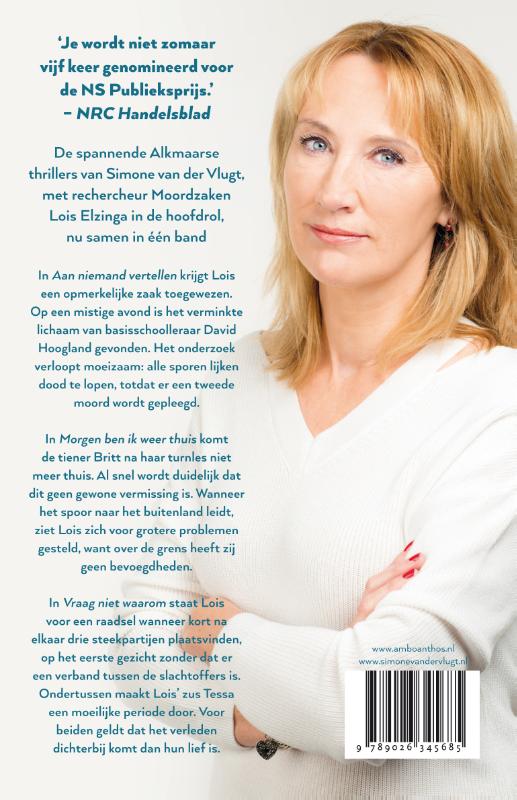 De Loïs Elzinga-serie van Simone van der Vlugt nu in één band! Een fantastische omnibus met drie boeken van Simone van der Vlugt: Aan niemand vertellen, Morgen ben ik weer thuis en Vraag niet waarom.