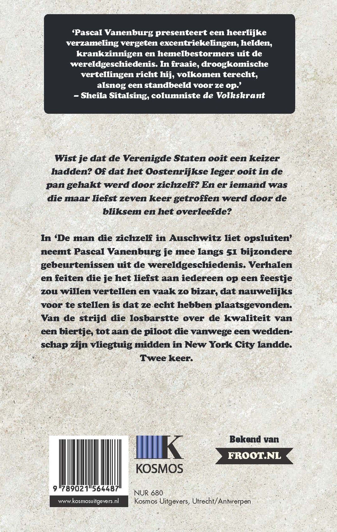 De man die zichzelf in Auschwitz liet opsluiten van Pascal Vanenburg is een verzameling van 51 gebeurtenissen uit de wereldgeschiedenis die zo bijzonder zijn dat je ze direct wilt doorvertellen. De verhalen zijn waargebeurd, indrukwekkend en vaak zo bizar dat je nauwelijks gelooft dat ze echt hebben plaatsgevonden. Pascal Vanenburg is journalist en redacteur, en schreef wekelijks voor de website froot.nl een kort verhaal over een bijzondere, onbekende gebeurtenis. Dit boek is gemaakt in samenwerking met Froot en is perfect voor de geschiedenisliefhebber, of gewoon voor iedereen die van een bizar verhaal houdt.