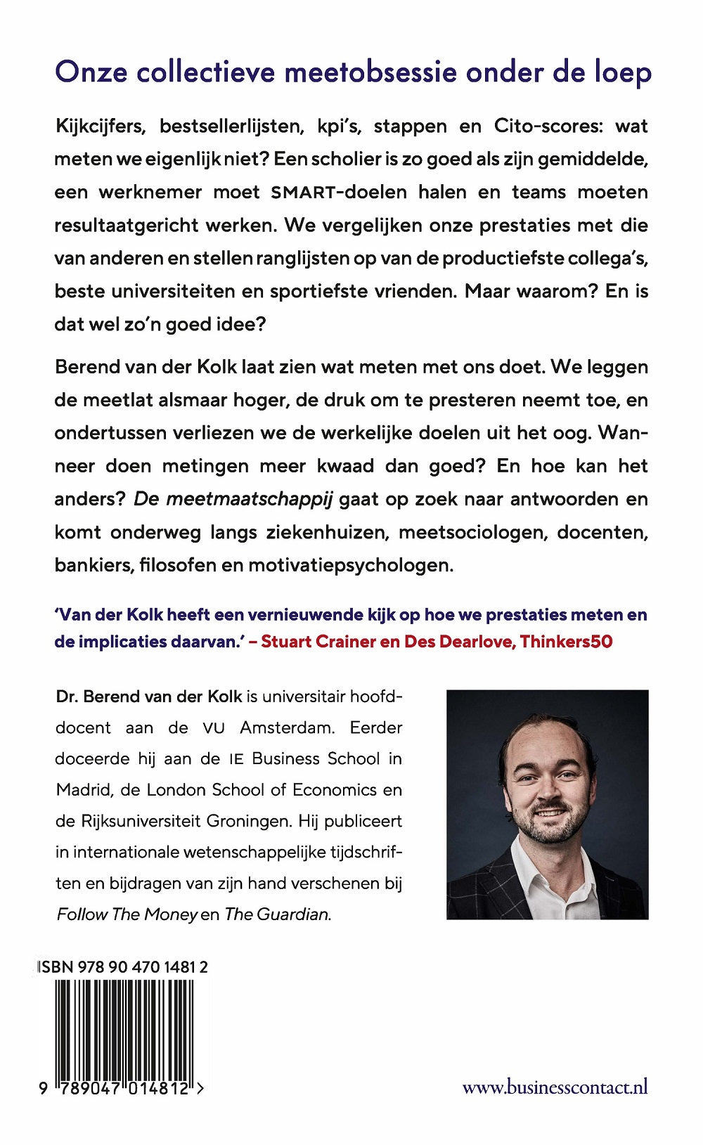Van der Kolk laat zien wat meten met ons doet. We leggen de meetlat alsmaar hoger, de druk om te presteren neemt toe, en ondertussen verliezen we de werkelijke doelen uit het oog. Wanneer doen metingen meer kwaad dan goed? En hoe kan het anders? ‘De meetmaatschappij’ gaat op zoek naar antwoorden en komt onderweg langs ziekenhuizen, meetsociologen, docenten, bankiers, filosofen en motivatiepsychologen.