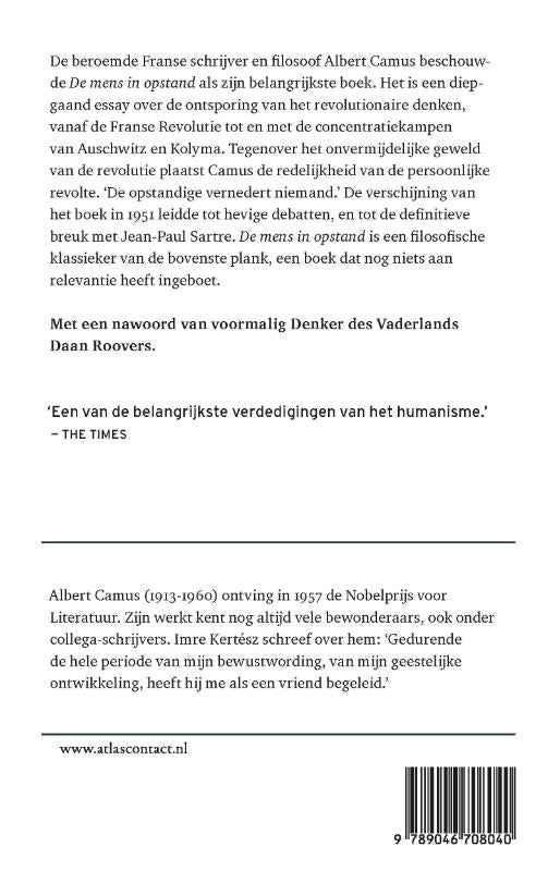 Albert Camus beschouwde De mens in opstand als zijn belangrijkste boek. Het is zijn 'poging om de tijd waarin ik leef te begrijpen' en een diepgaand essay over de ontsporing van het revolutionaire denken. Hij levert gedurfde kritiek op het communisme - hoe het mis was gegaan achter het IJzeren Gordijn en de daaruit voortvloeiende totalitaire regimes, en zet vraagtekens bij twee gebeurtenissen die door de linkervleugel als heilig werden beschouwd - de Franse Revolutie van 1789 en de Russische Revolutie van 1917 - die volgens hem hadden geleid tot terrorisme als politiek instrument.