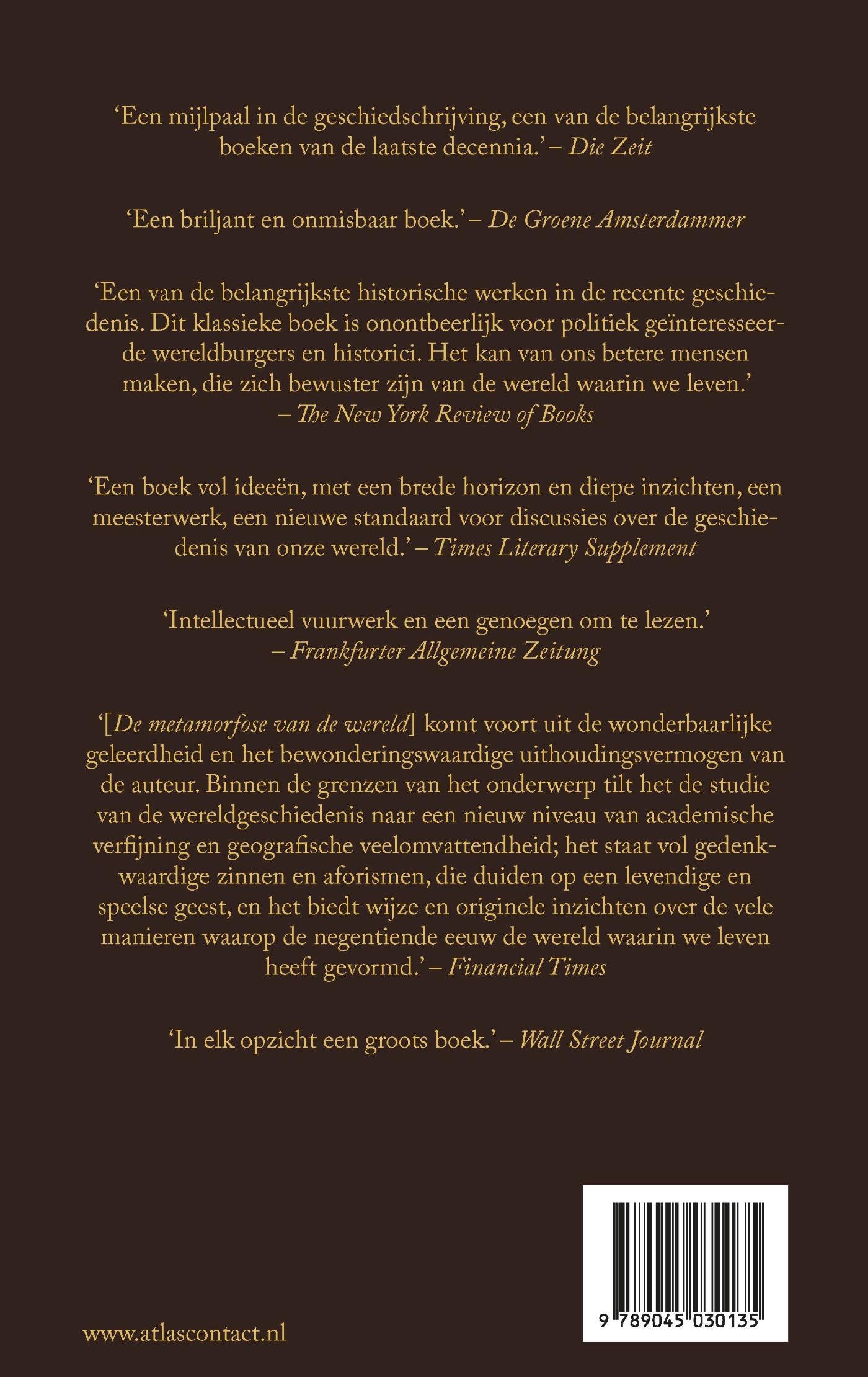 De metamorfose van de wereld is een monumentale geschiedenis van de negentiende eeuw. Jürgen Osterhammel vertelt een waarlijk mondiale (geen eurocentrische) geschiedenis met een adembenemende reikwijdte en een enorme eruditie. Hij neemt de lezer mee van Londen naar New Delhi, van de Latijns-Amerikaanse revoluties naar de Taipingopstand, van de opera van Parijs naar die van Manaus in Brazilië, van Europese emigranten naar de bedreigde nomadische stammen overal op onze planeet. Hij vertelt over een wereld die steeds meer vervlochten raakt door de telegraaf, het stoomschip en de spoorweg. Hij onderzoekt de veranderende relatie tussen mens en natuur, gaat uitvoerig in op de rol van de slavernij en de afschaffing ervan bij de opkomst van nieuwe naties, en vecht de wijdverbreide overtuiging aan dat in de negentiende eeuw de natiestaat triomfeerde.
