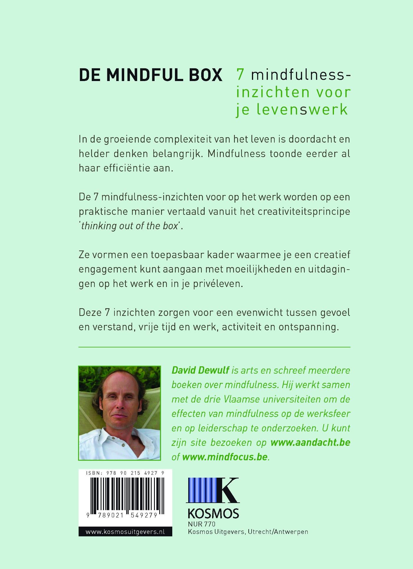 In deze groeiende complexiteit van het leven is doordacht en helder denken belangrijk. Mindfulness - aandachtig leven in het hier en nu - kan daarvoor zorgen. De 7 mindfulness principes voor op het werk zijn een inzichtelijke en praktische vertaling van het creativiteitsprincipe 'thinking out of the box'. Ze vormen een praktische kader van waaruit je een creatieve relatie kunt aangaan met moeilijkheden of uitdagingen op het werk.
