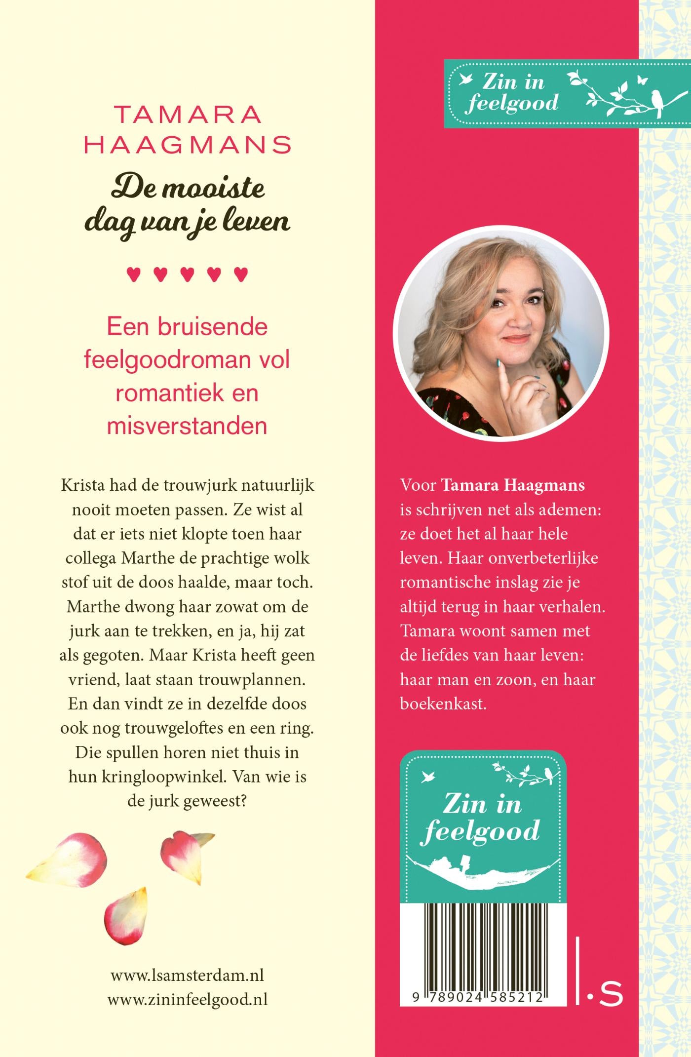 In De mooiste dag van je leven van Tamara Haagmans vindt Krista, medewerker bij een kringloopwinkel, in een oude doos een trouwjurk. Op aandringen van haar collega Marthe past ze de jurk en... hij zit als gegoten. Maar Krista heeft geen vriend, laat staan trouwplannen. Dan vindt ze in dezelfde doos ook nog trouwgeloftes en een ring. Van wie is de jurk geweest?
