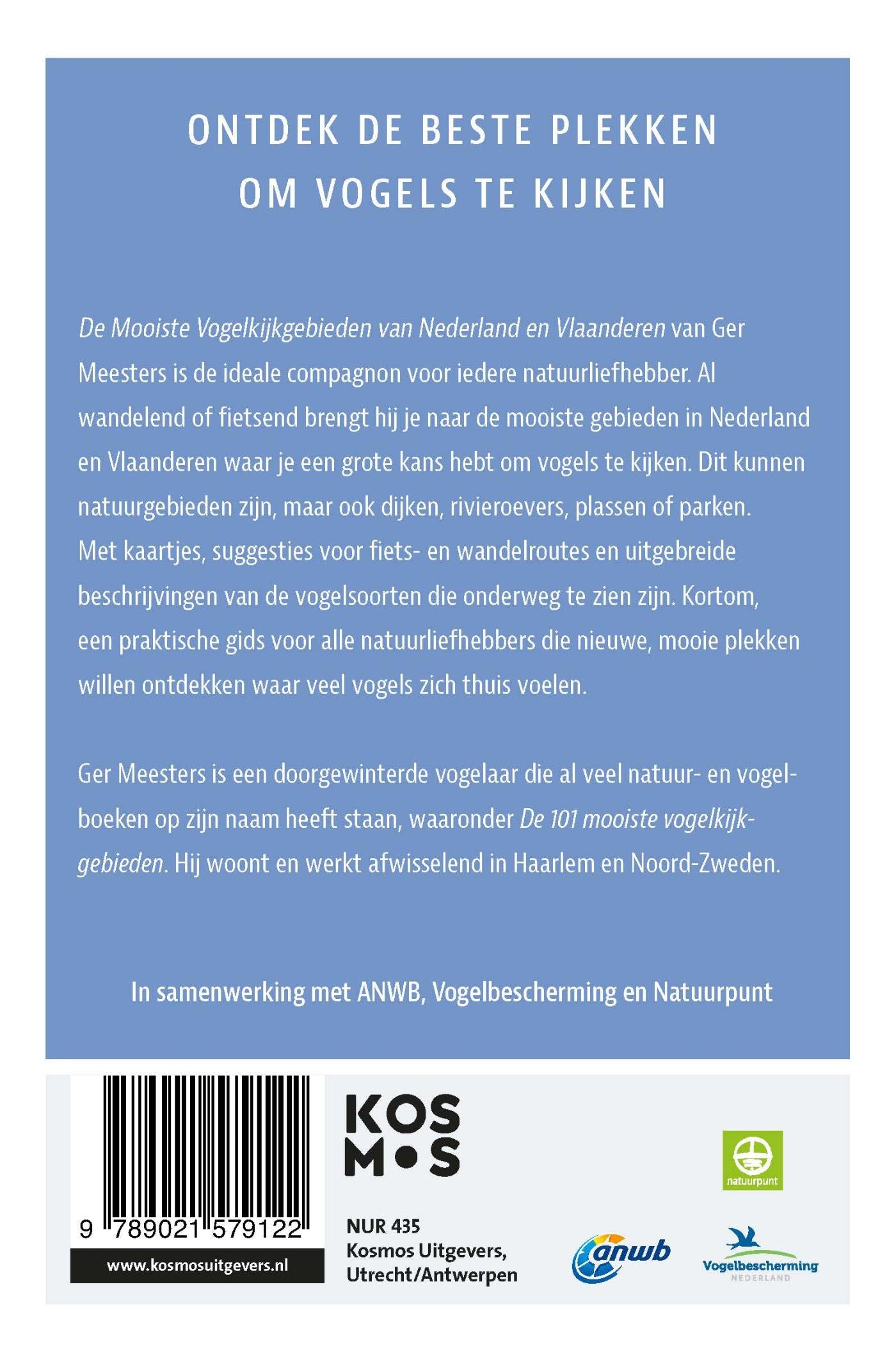 Wie van vogels houdt en er graag op uittrekt, vindt in ‘De mooiste vogelkijkgebieden van Nederland en België’ van doorgewinterde vogelaar Ger Meesters de beste gebieden in Nederland en Vlaanderen om vogels te spotten. Dit kunnen natuurgebieden zijn, maar ook dijken, rivieroevers, plassen of parken. Met kaartjes, suggesties voor fiets- en wandelroutes en uitgebreide beschrijvingen van de vogelsoorten die onderweg te zien zijn. Kortom, een praktische gids voor alle natuurliefhebbers die nieuwe, mooie plekken willen ontdekken waar vele vogels zich thuisvoelen.