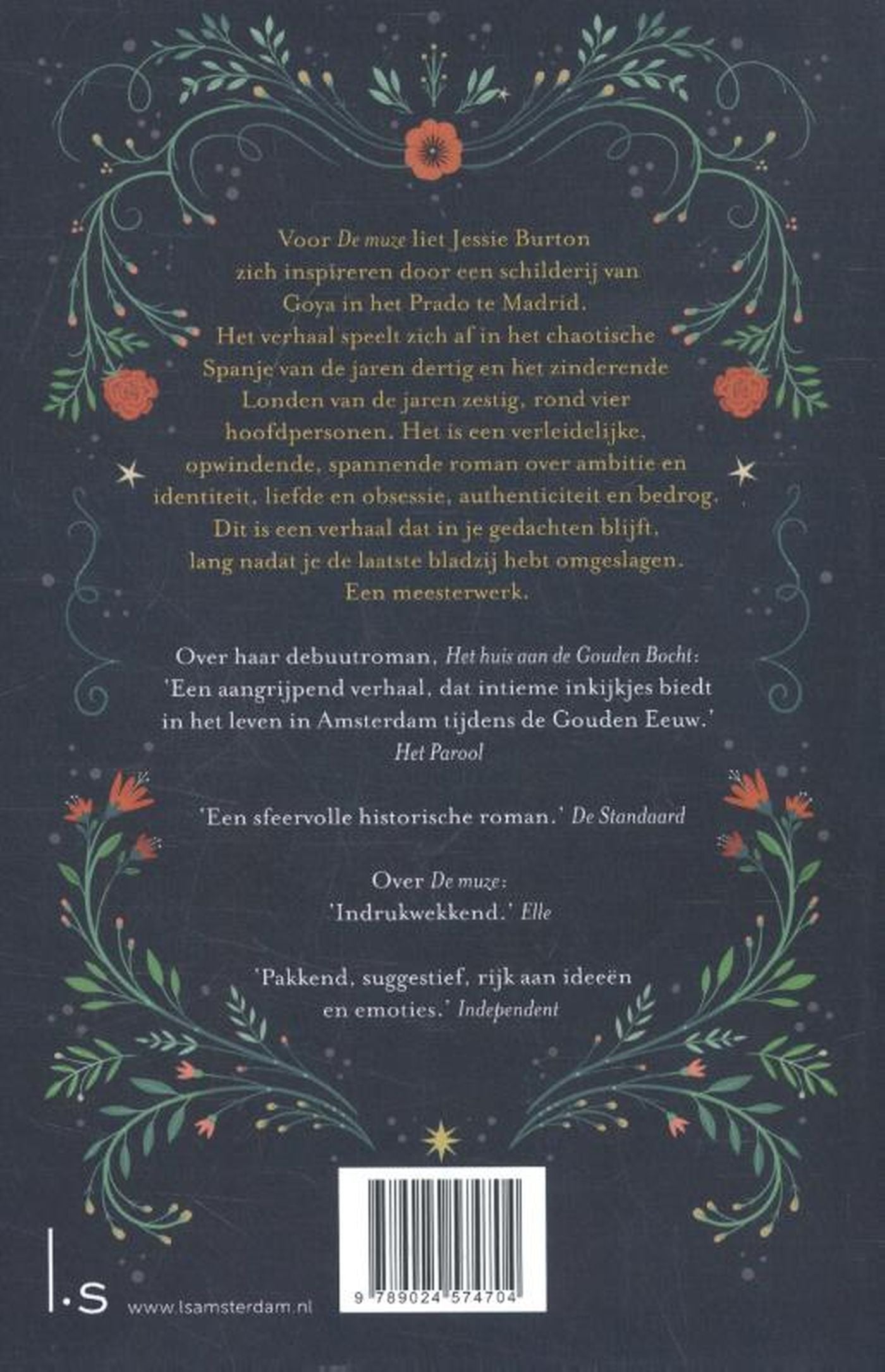 Voor De muze liet Jessie Burton zich inspireren door een schilderij van Goya dat in het Prado te Madrid hangt. Het verhaal speelt zich af in het chaotische Spanje van de jaren dertig en het zinderende Londen van de jaren zestig, rond vier hoofdpersonen. Het is een verleidelijke, opwindende, spannende roman over ambitie en identiteit, over liefde en obsessie, authenticiteit en bedrog. Dit is een verhaal dat in je gedachten blijft, lang nadat je de laatste bladzijde hebt gelezen. Een meesterwerk!