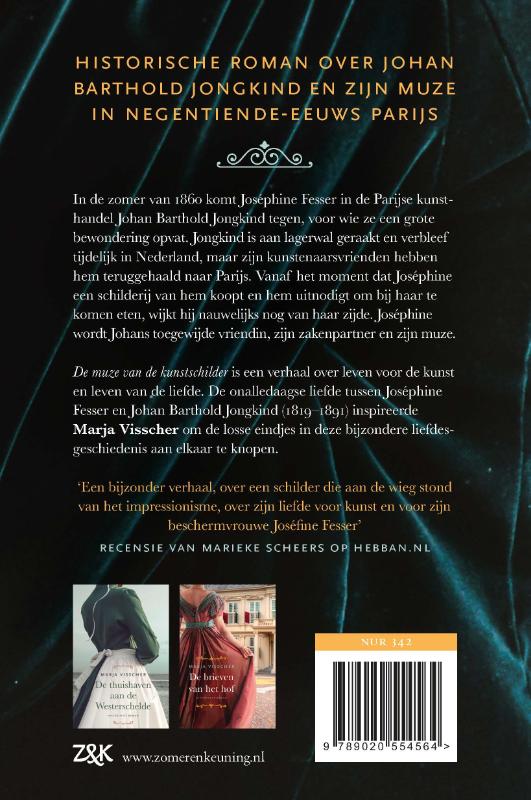 'De muze van de kunstschilder' van Marja Visscher neemt je vanuit het perspectief van Joséphine Fesser mee in het leven van de schilder Johan Barthold Jongkind (1819-1891), voor wie zij al bij hun eerste ontmoeting een grote bewondering opvat. Jongkind was aan lagerwal geraakt en verbleef daarom tijdelijk in Nederland, maar zijn kunstenaarsvrienden hebben hem teruggehaald naar Parijs. Joséphine koopt een schilderij van hem en nodigt hem uit om bij haar te komen eten. Vanaf dat moment wijkt hij nauwelijks nog van haar zijde. 'De muze van de kunstschilder' is een intrigerend verhaal over leven voor de kunst en leven van de liefde.