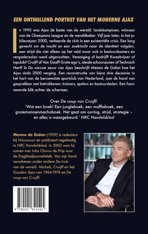 In 1995 was Ajax de beste van de wereld: landskampioen, winnaar van de Champions League en de wereldbeker. Vijf jaar later, in het jubileumjaar 2000, verkeerde de club in een existentiële crisis. Een lang gevecht om de macht en een zoektocht naar de identiteit volgden, een strijd die niet alleen op het veld maar ook in bestuurskamers en vergaderzalen werd uitgevochten. Vereniging of bedrijf? Kweekvijver of topclub? Cruijff of Van Gaal? Koorknapen, ideale schoonzonen of Technisch Hart? In ‘De nieuwe eeuw’ van Ajax beschrijft Menno de Galan hoe het Ajax sinds 2000 verging. Een reconstructie van twee decennia in het hart van de beroemdste sportclub van Nederland, aan de hand van gesprekken met betrokkenen: trainers, spelers en bestuursleden. Een fascinerende blik achter de schermen.