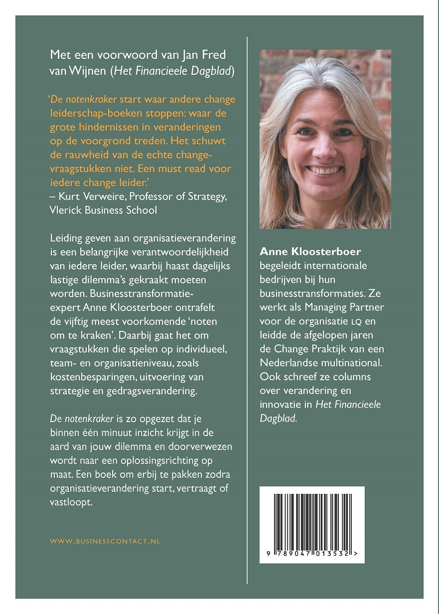 In ‘De notenkraker’ ontrafelt businesstransformatie-expert Anne Kloosterboer de vijftig meest voorkomende ‘noten om te kraken’ bij organisatieverandering. Leiding geven aan organisatieverandering is een belangrijke verantwoordelijkheid van iedere leider, waarbij haast dagelijks lastige dilemma’s gekraakt moeten worden. Daarbij gaat het om vraagstukken die spelen op individueel, team- en organisatieniveau, zoals kostenbesparingen, uitvoering van strategie en gedragsverandering.