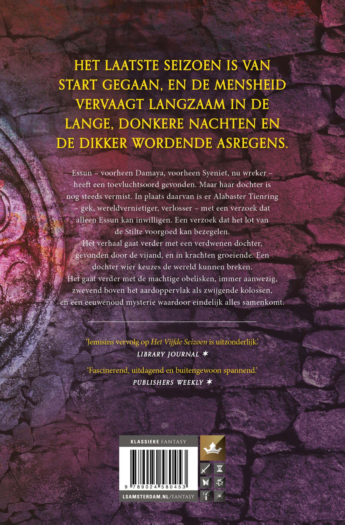 Een genrebrekende roman over klimaatverandering, rassenscheiding en onderdrukking in een wereld waarin meedogenloze natuurkrachten complete beschavingen wegvagen. Het laatste Seizoen is van start gegaan, en de mensheid vervaagt langzaam in de lange, donkere nachten en de dikker wordende asregens. Essun – voorheen Damaya, voorheen Syenite, nu wreker – heeft een schuilplaats gevonden. Maar haar dochter is nog steeds vermist. In plaats daarvan is er Alabaster Tienring – gek, wereldvernietiger, verlosser – met een verzoek dat alleen Essun kan inwilligen. Een verzoek dat het lot van de Stilte voor goed kan bezegelen. Het verhaal gaat verder met een verdwenen dochter, gevonden door de vijand, en in krachten groeiende. Een dochter wiens keuzes de wereld kunnen breken. Het gaat verder met de machtige obelisken, immer aanwezig, zwevend boven het aardoppervlak als zwijgende kolossen, en een eeuwenoud mysterie dat eindelijk samenkomt.