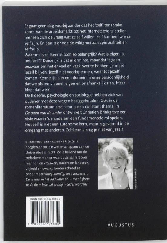 Er gaat geen dag voorbij zonder dat het zelf ter sprake komt. Van de arbeidsmarkt tot het internet: overal stellen mensen zich de vraag wat ze zelf willen, zelf kunnen, wie ze zelf zijn. En dan is er nog de wildgroei aan spiritualiteit en zelfhulp. Waarom is zelfkennis toch zo belangrijk? Wat is eigenlijk het zelf? Duidelijk is dat allerminst, maar dat is geen bezwaar om het er veel en vaak over te hebben: je moet jezelf blijven, jezelf niet voorbijrennen, weer tot jezelf komen. Kennelijk is er een domein in onze persoonlijkheid dat we als individueel, eigen en onafhankelijk zien. Maar klopt dat wel? De filosofie, psychologie en sociologie hebben zich van oudsher met deze vragen beziggehouden. Ook in de romanliteratuur is zelfkennis een constant thema. In De ogen van de ander ontwikkelt Christien Brinkgreve een visie waarin de anderen een fundamentele rol spelen. Het zelf is niet een autonome kern, maar is gevormd in de omgang met anderen.
