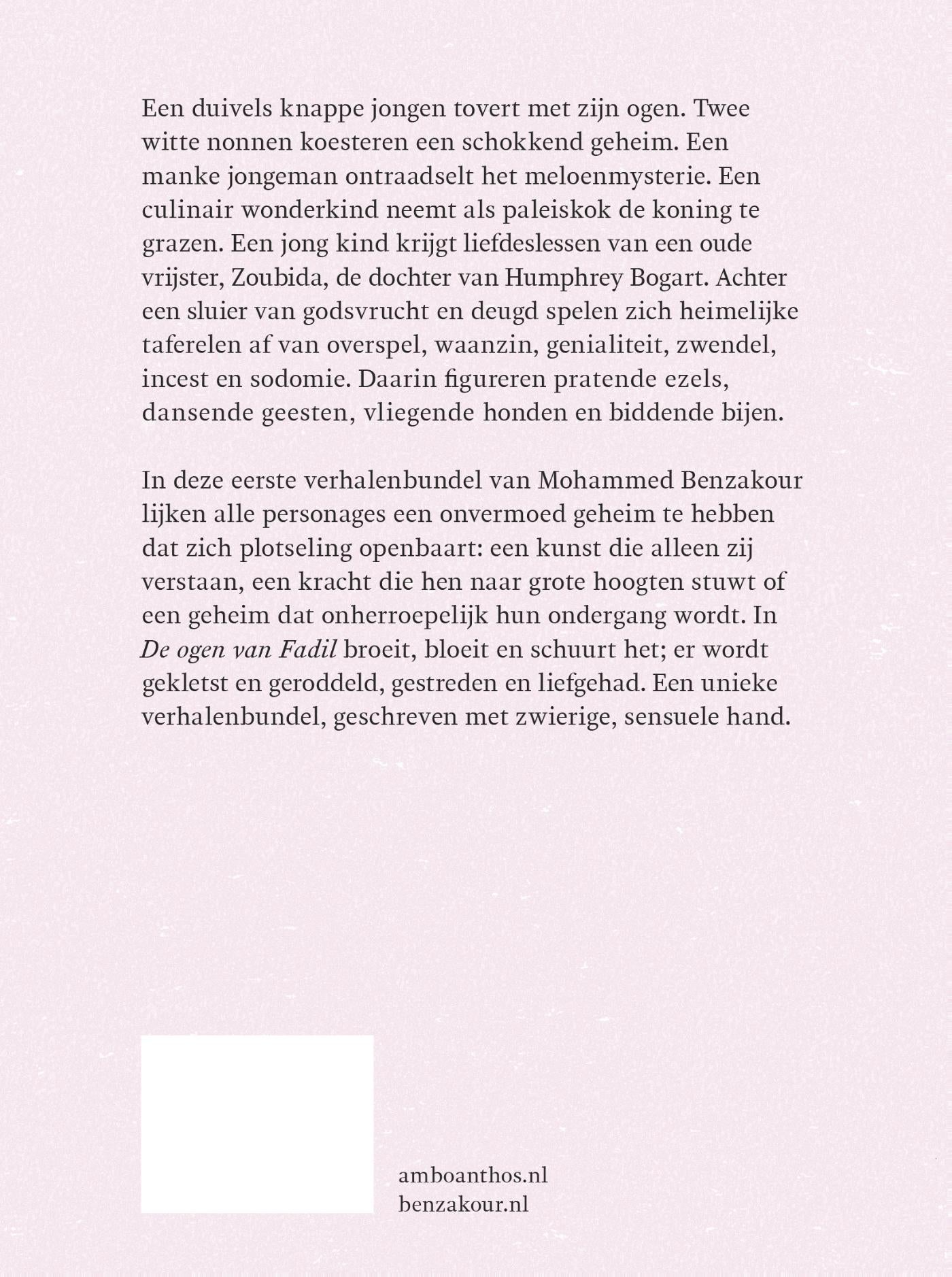 In De ogen van Fadil, de eerste verhalenbundel van veelgeprezen en geliefd verhalenverteller Mohammed Benzakour, wordt gekletst en geroddeld, gestreden en liefgehad. Een unieke verhalenbundel, geschreven met zwierige, sensuele hand.