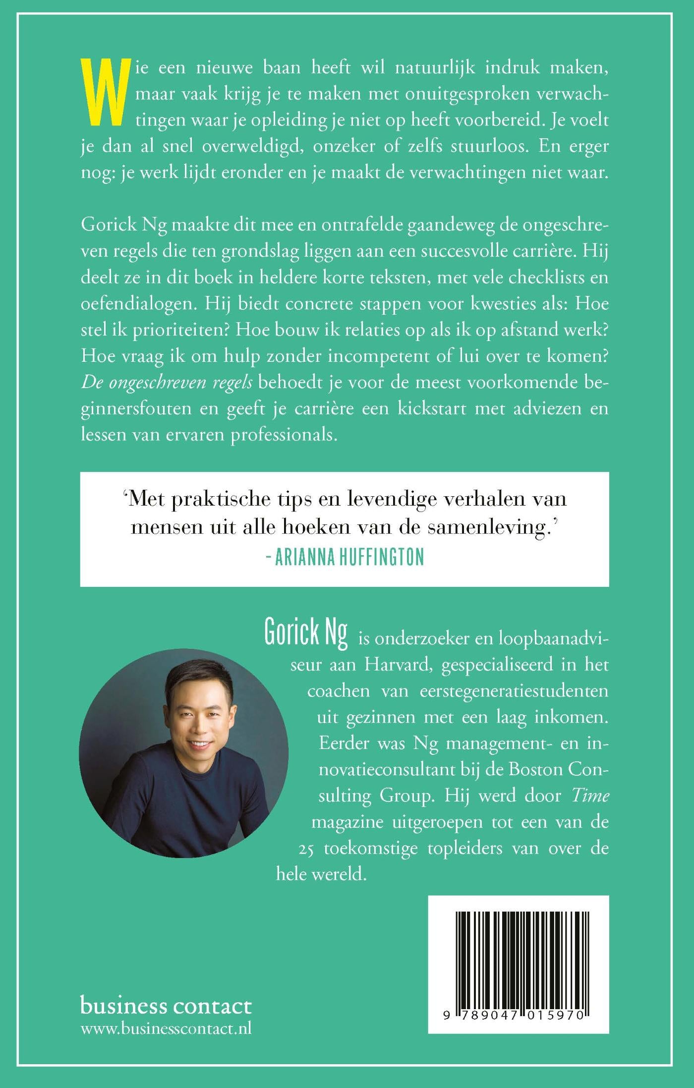 Gorick Ng maakte dit mee en ontrafelde gaandeweg de ongeschreven regels die ten grondslag liggen aan een succesvolle carrière. Hij deelt ze in dit boek in heldere korte teksten, met vele checklists en oefendialogen. Hij biedt concrete stappen voor kwesties als: Hoe stel ik prioriteiten? Hoe bouw ik relaties op als ik op afstand werk? Hoe vraag ik om hulp zonder incompetent of lui over te komen? De ongeschreven regels behoedt je voor de meest voorkomende beginnersfouten en geeft je carrière een kickstart met adviezen en lessen van ervaren professionals.