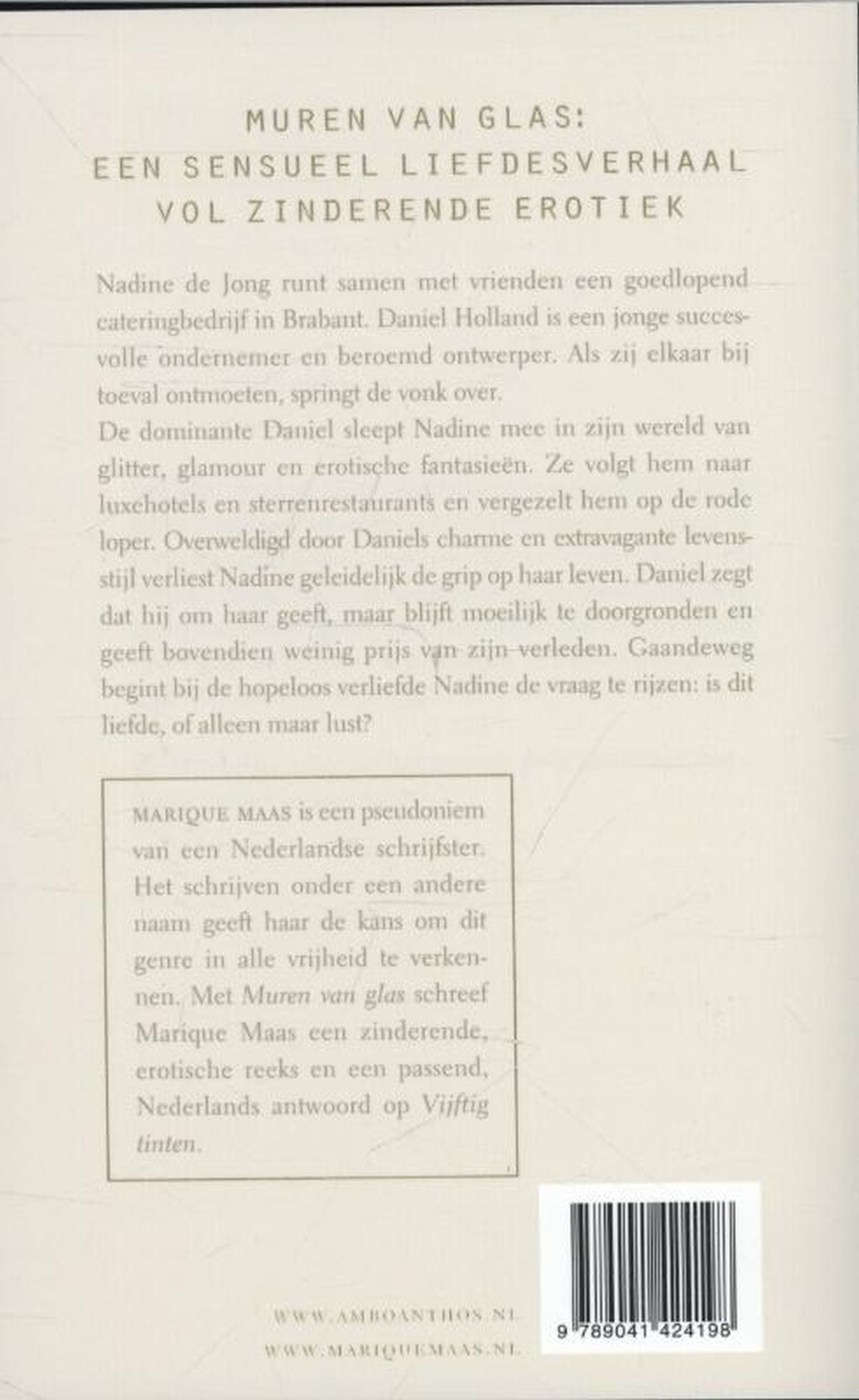 Met Muren van glas schreef Marique Maas een zinderende, erotische serie, waarin glitter, glamour en seksuele fantasieën de boventoon voeren. De ontmoeting is het eerste deel in de reeks.Wanneer de Brabantse Nadine de jonge succesvolle en beroemde ontwerper Daniel ontmoet springt de vonk over. Overweldigd door zijn charme en extravagante levensstijl verliest ze geleidelijk de grip op haar leven. Gaandeweg begint de vraag te rijzen: is dit liefde, of alleen maar lust?