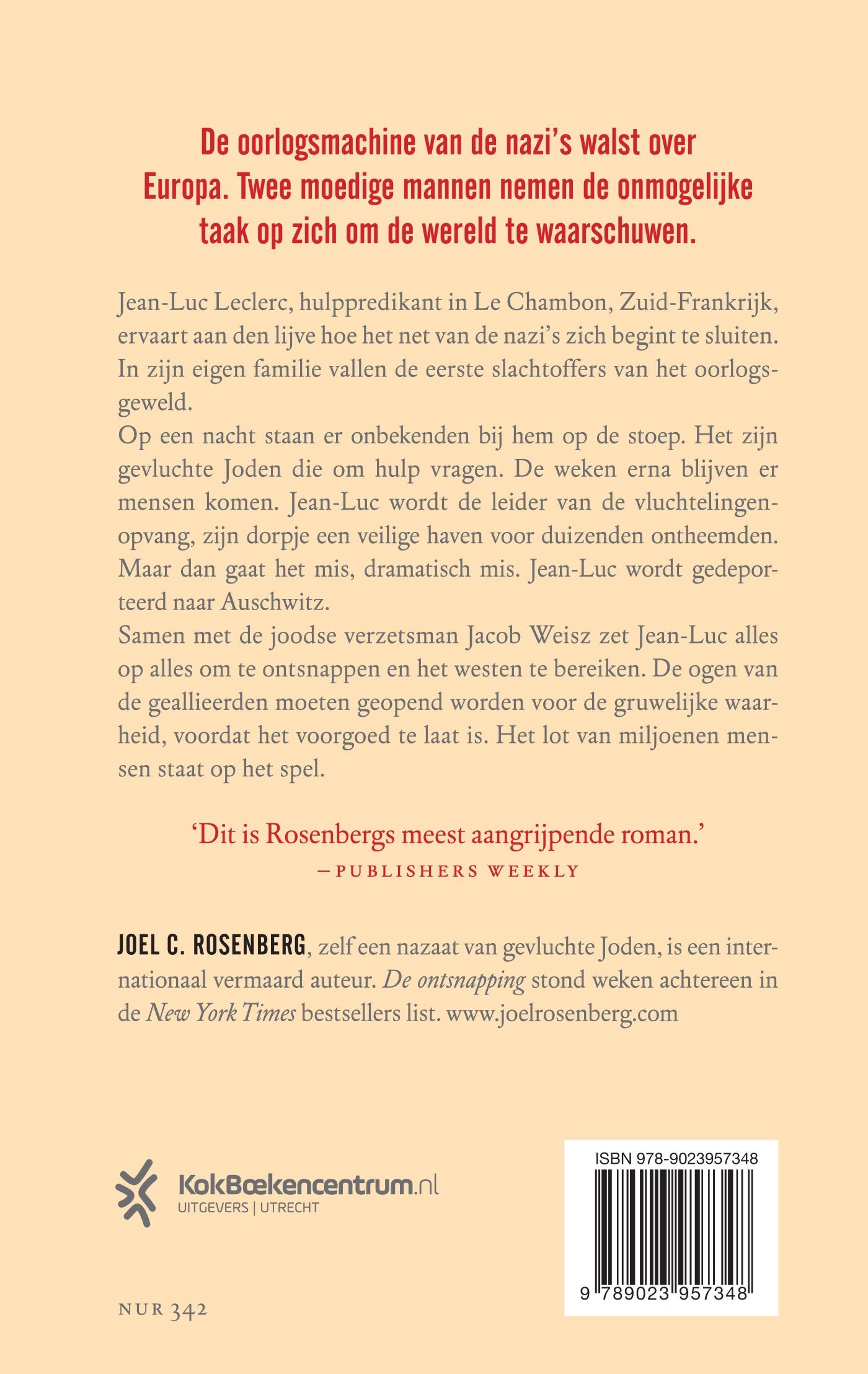 De ontsnapping van Joel Rosenberg is een historische roman over twee mannen die ontsnappen uit Auschwitz om de wereld te waarschuwen. De Franse predikant Jean-Luc Leclerc wordt ongewild de leider van de opvang voor gevluchte Joden. Zijn dorpje wordt een veilige haven voor duizenden ontheemden. Maar dan gaat het dramatisch mis. Jean-Luc wordt gedeporteerd naar Auschwitz. Samen met Jacob Weisz, een joodse verzetsman, besluit hij te ontsnappen om het westen te bereiken. Koste wat kost moeten de ogen van de geallieerden geopend worden voor de gruwelijke waarheid van wat zich in Polen afspeelt. Het lot van miljoenen mensen staat op het spel.