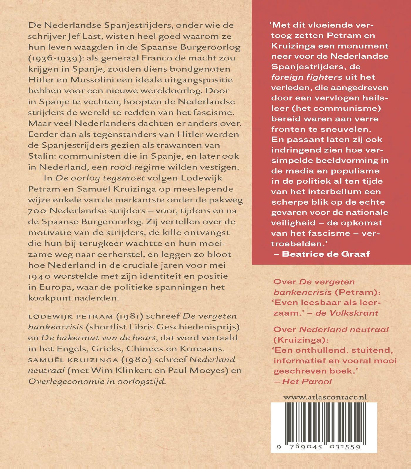 In ‘ De oorlog tegemoet’ volgen Lodewijk Petram en Samuël Kruizinga op meeslepende wijze enkele van de Nederlandse strijders – voor, tijdens en na de Spaanse Burgeroorlog (1936-1939). Zij vertellen over de motivatie van de strijders, de kille ontvangst die hun bij terugkeer wachtte en hun moeizame weg naar eerherstel, en leggen zo bloot hoe Nederland in de cruciale jaren voor mei 1940 worstelde met zijn identiteit en positie in Europa, waar de politieke spanningen het kookpunt naderden.
