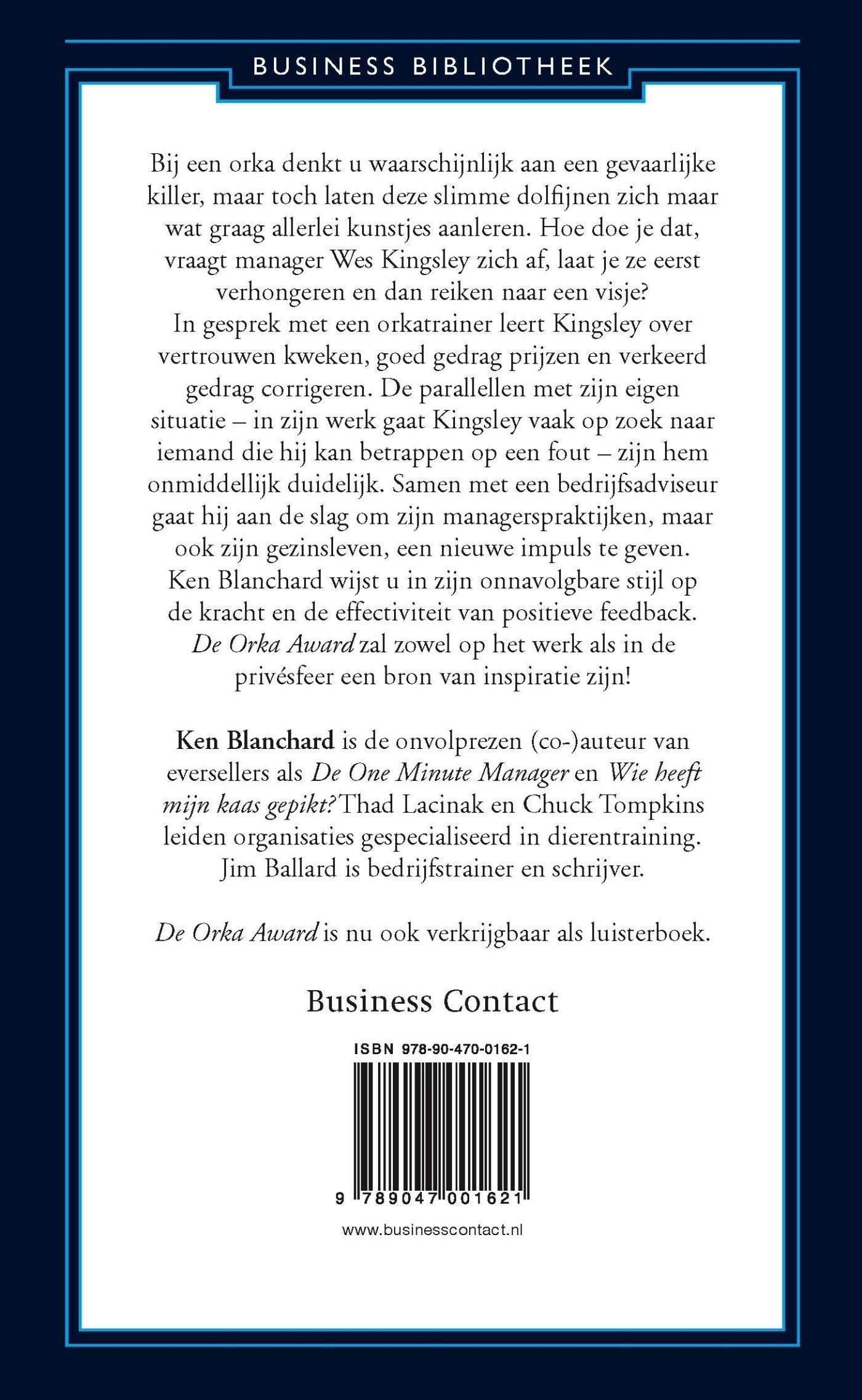 Bij een orka denkt u waarschijnlijk aan een gevaarlijke killer, maar toch laten deze slimme dolfijnen zich maar wat graag allerlei kunstjes aanleren. Hoe doe je dat, vraagt manager Wes Kingsley zich af, laat je ze eerst verhongeren en dan reiken naar een visje? In gesprek met een orkatrainer leert Kingsley over vertrouwen kweken, goed gedrag prijzen en verkeerd gedrag corrigeren. De parallellen met zijn eigen situatie -- in zijn werk gaat Kingsley vaak op zoek naar iemand die hij kan betrappen op een fout -- zijn hem onmiddellijk duidelijk. Samen met een bedrijfsadviseur gaat hij aan de slag om zijn managerspraktijken, maar ook zijn gezinsleven, een nieuwe impuls te geven. Kenneth Blanchard wijst u in zijn onnavolgbare stijl op de kracht en de effectiviteit van positieve feedback. De Orka Award zal zowel op het werk als in de privésfeer een bron van inspiratie zijn! Ken Blanchard is de onvolprezen (co-)auteur van eversellers als De One Minute Manager en Wie heeft mijn kaas gepikt? Thad Lacinak en Chuck Tompkins leiden organisaties gespecialiseerd in dierentraining. Jim Ballard is bedrijfstrainer en schrijver.
