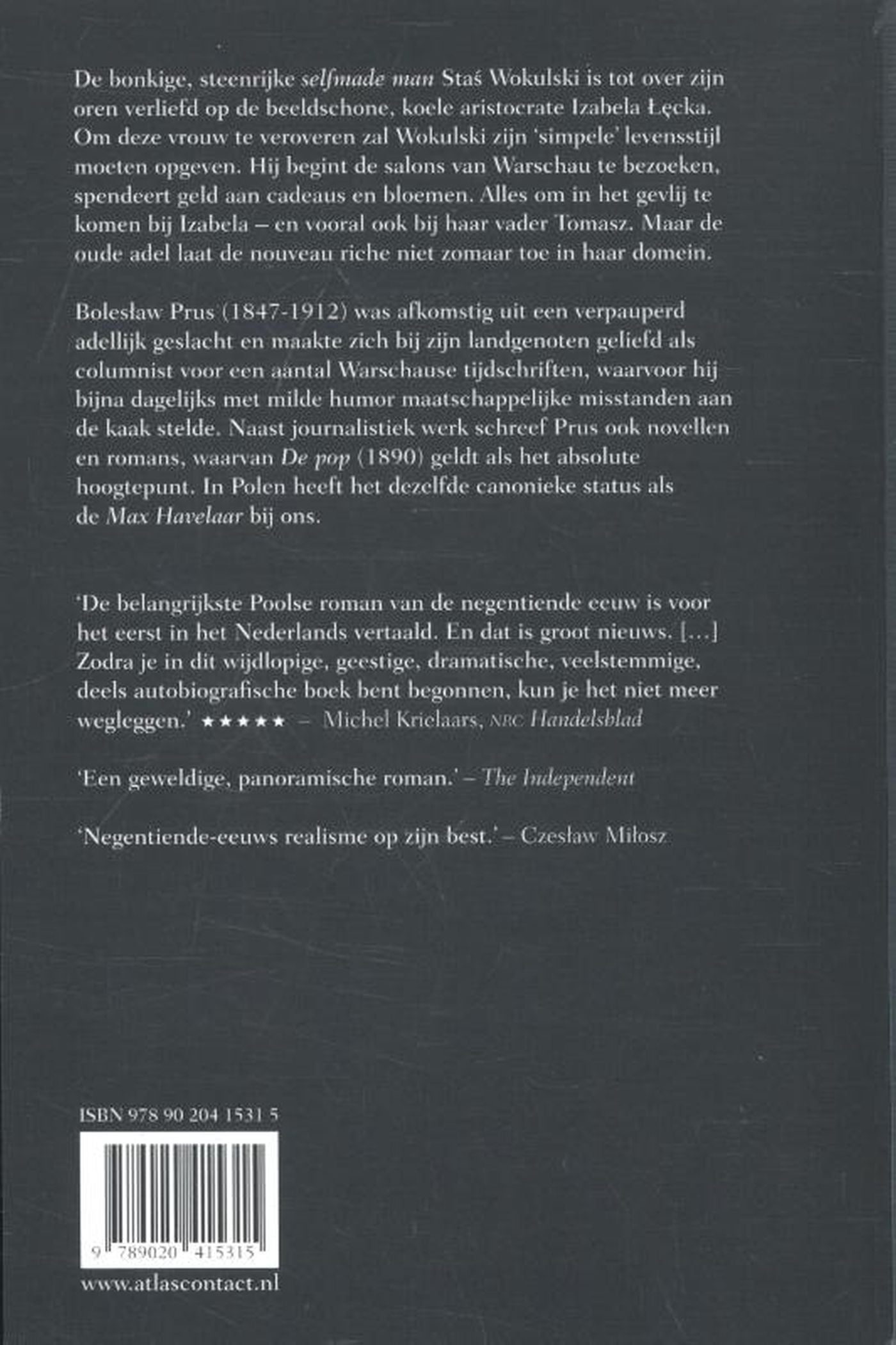Wat 'Madame Bovary' is voor de Franse literatuur en 'Anna Karenina' voor de Russische is 'De pop' voor de Poolse. Velen beschouwen het magnum opus van Boleslaw Prus als de grootste Poolse roman van de negentiende eeuw – of zelfs van alle tijden. Net als in die andere twee epische meesterwerken staat ook in 'De pop' een tragische liefdesgeschiedenis centraal. De bonkige, steenrijke selfmade man Stás Wokulski is tot over zijn oren verliefd op de beeldschone, koele aristocrate Izabela Lecka. Om deze vrouw te veroveren zal Wokulski zijn ‘simpele’ levensstijl moeten opgeven. Hij begint de salons van Warschau te bezoeken, spendeert geld aan cadeaus en bloemen. Alles om in het gevlij te komen bij Izabela – en vooral ook bij haar vader Tomasz. Maar de oude adel laat de nouveau riche niet zomaar toe in haar domein. Behalve een aangrijpend liefdesverhaal is 'De pop' daarmee ook een roman over de verwoestende werking van klasseverschillen.