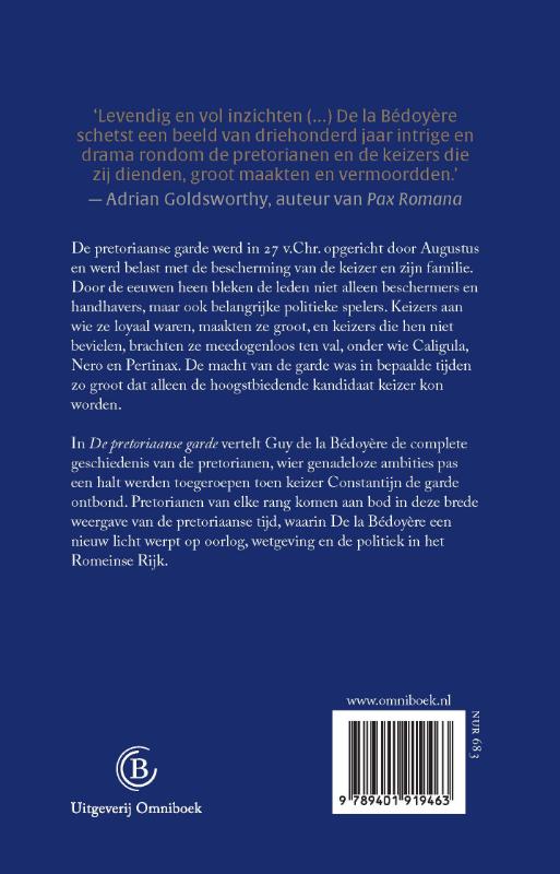 In ‘De pretoriaanse garde’ beschrijft Guy de la Bédoyère de geschiedenis van de in 27 v.Chr. opgerichte keizerlijke lijfwacht, die belast was met de bescherming van de zowel de keizer als zijn familie. Door de eeuwen heen bleken de leden niet alleen beschermers en handhavers, maar ook belangrijke politieke spelers. Keizers aan wie ze loyaal waren, maakten ze groot, en keizers die hen niet bevielen, brachten ze meedogenloos ten val, onder wie Caligula, Nero en Pertinax. De macht van de garde was in bepaalde tijden zo groot dat alleen de hoogstbiedende kandidaat keizer kon worden.