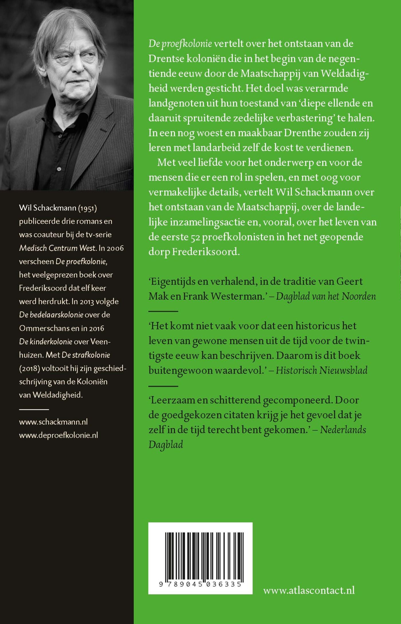 In ‘De proefkolonie’ vertelt auteur Wil Schackmann over het ontstaan van de Drentse koloniën die in het begin van de negen-tiende eeuw door de Maatschappij van Weldadig-heid werden gesticht. Het doel was verarmde landgenoten uit hun toestand van ‘diepe ellende en daaruit spruitende zedelijke verbastering’ te halen. In een nog woest en maakbaar Drenthe zouden zij leren met landarbeid zelf de kost te verdienen.