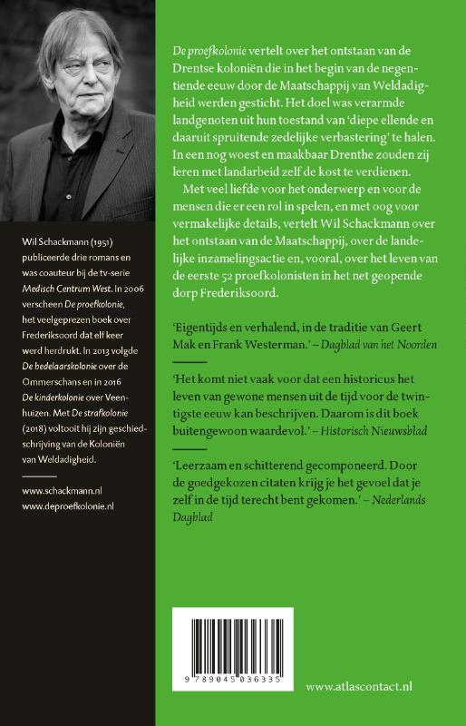 In ‘De proefkolonie’ vertelt auteur Wil Schackmann over het ontstaan van de Drentse koloniën die in het begin van de negen-tiende eeuw door de Maatschappij van Weldadig-heid werden gesticht. Het doel was verarmde landgenoten uit hun toestand van ‘diepe ellende en daaruit spruitende zedelijke verbastering’ te halen. In een nog woest en maakbaar Drenthe zouden zij leren met landarbeid zelf de kost te verdienen.
