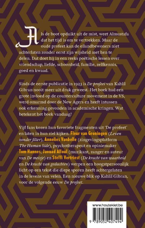 Vijf fans kozen hun favoriete fragmenten uit ‘De profeet’ en laten in hun ziel kijken. Fleur van Groningen ('Leven zonder filter'), Annelies Vanbelle (van zingevingsplatform The Human Side), psychotherapeut en opiniemaker Tom Hannes, Jaouad Alloul (muzikant, zanger en auteur van De meisje) en Steffi Vertriest ('De kracht van waarheid' en 'De kracht van gedachten') werpen een hoogstpersoonlijk licht op een tekst die diepe sporen heeft achtergelaten in de levens van velen. Een nieuwe blik op Kahlil Gibran, voor de volgende eeuw 'De profeet'.