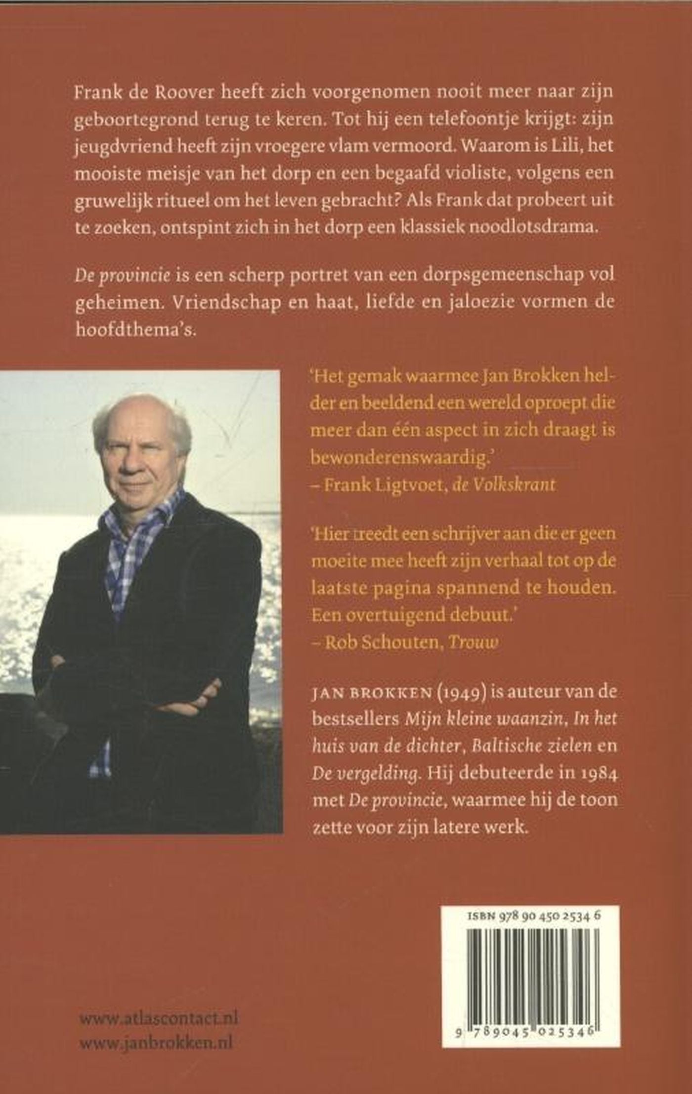 In 1984 debuteerde Jan Brokken met De provincie, waarmee hij de toon zette voor de rest van zijn werk. In De provincie heeft de hoofdpersoon zich voorgenomen zijn geboorteland voorgoed te verlaten, tot hij hoort dat een jeugdvriend de mooiste vrouw van het dorp, een begaafd violiste en getalenteerde verleidster, om het leven heeft gebracht. Hij keert terug naar zijn dorp, waar zich een klassiek noodlotsdrama ontspint. De provincie is een scherp portret van een dorpsgemeenschap waarin vriendschap en haat, liefde en jaloezie de hoofdthema's vormen.