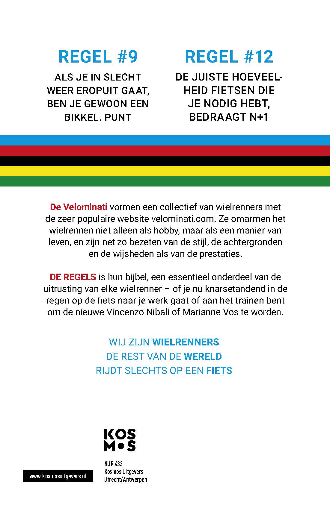 De regels is dé gids voor wielrenners. Hij is gemaakt door de Velominati, een Engelstalig collectief van wielerliefhebbers, bekend van de zeer populaire website Velominati.com. Zij omarmen het wielrennen niet alleen als hobby, maar als een manier van leven, en zijn net zo bezeten van de stijl, de achtergronden en de wijsheden als van de prestaties. De regels is een essentieel onderdeel van de uitrusting van elke wielrenner – of je nu knarsetandend in de regen op de fiets naar je werk gaat of je je voorbereidt om die nieuwe Bernal of Van Vleuten te worden.