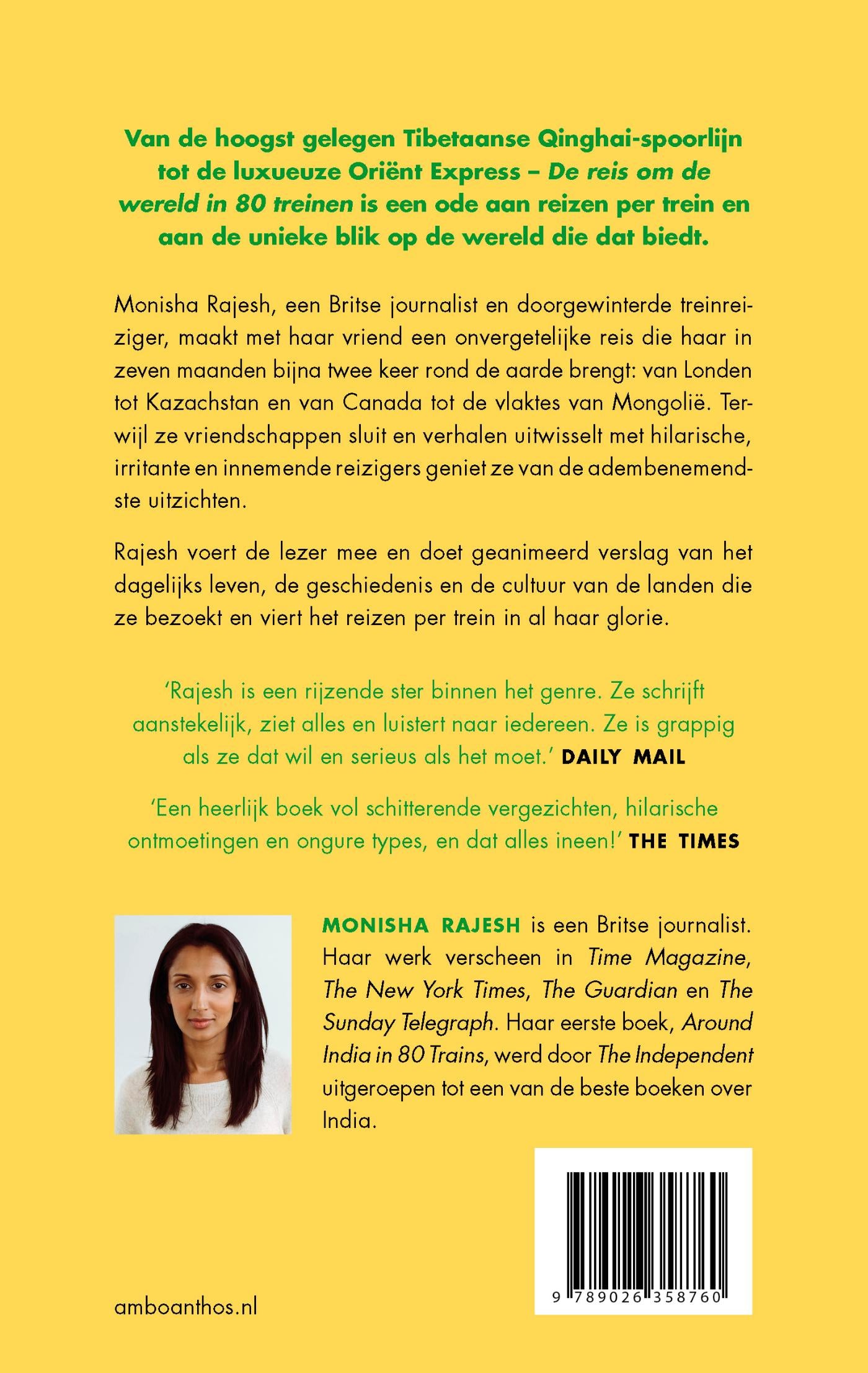 Monisha Rajesh, Britse journalist en doorgewinterde treinreiziger, maakte met haar vriend een onvergetelijke reis die haar in zeven maanden bijna twee keer rond de aarde bracht: van Londen tot Kazachstan en van Canada tot de vlaktes van Mongolië. Terwijl ze vriendschappen sloot en verhalen uitwisselde met hilarische, irritante en innemende reizigers genoot ze van de adembenemendste uitzichten.