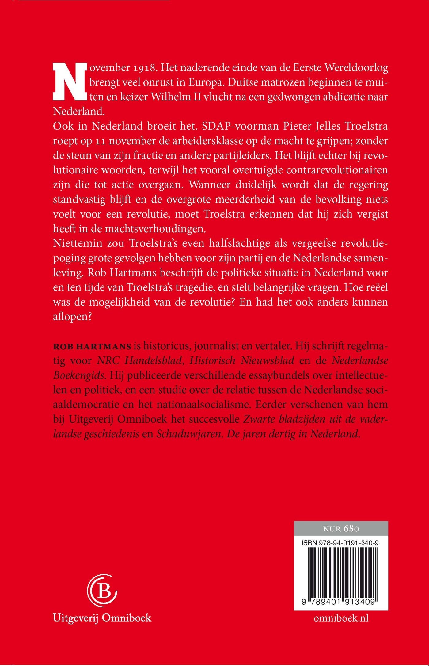 In ‘De revolutie die niet doorging’ beschrijft Rob Hartmans de tragedie van Pieter Jelles Troelstra. In november 1918 breken er tal van revoluties uit in Europa. Ook in Nederland gist het. Socialistische leiders denken dat het einde van de monarchie en de kapitalistische orde is aangebroken. SDAP-voorman Pieter Jelles Troelstra roept op 11 november de arbeidersklasse op de macht te grijpen. Royalistische contrabewegingen zijn echter veel krachtdadiger en beter georganiseerd, zodat de zogenaamde ‘Rode Week’ eindigt in een massale steunbetuiging voor koningin Wilhelmina. Troelstra ziet in dat hij zich vergist heeft en stort in. In ‘De revolutie die niet doorging’ stelt Rob Hartmans de interessante vraag: had het ook anders kunnen aflopen?