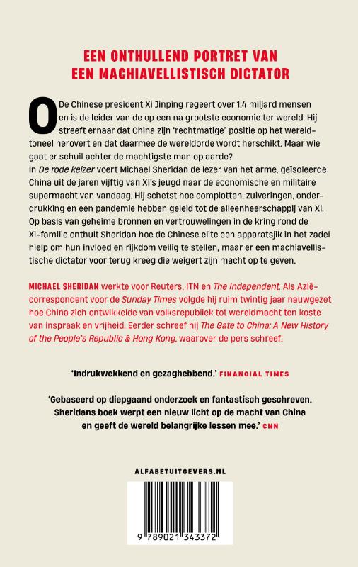 De Chinese president Xi Jinping regeert over 1,4 miljard mensen en is de leider van de op een na grootste economie ter wereld. Sinds hij alle macht naar zich heeft toegetrokken en zelfs de grondwet heeft laten wijzigen, kan hij zijn leven lang president blijven. Hij streeft ernaar dat China zijn ‘rechtmatige’ positie op het wereldtoneel herovert en daardoor de wereldorde zal worden herschikt. Onder Xi’s leiding verandert China van een autoritaire staat in een totalitaire samenleving. Maar wie gaat er schuil achter de machtigste man op aarde, van wie wordt gezegd dat hij de Mao van de 21e eeuw wil worden? In De rode keizer voert Michael Sheridan de lezer van het arme, geïsoleerde China uit de jaren vijftig van Xi’s jeugd naar de economische en militaire supermacht van vandaag. Hij schetst hoe complotten, zuiveringen, onderdrukking en een pandemie hebben geleid tot de alleenheerschappij van Xi. Op basis van geheime bronnen en vertrouwelingen in de kring van de Xi-familie onthult Sheridan hoe de Chinese elite een apparatsjik in het zadel hielp om hun invloed en rijkdom veilig te stellen, maar er een machiavellistische dictator voor terugkreeg die weigert zijn macht op te geven.