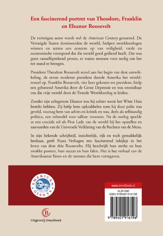 Frans Verhagen schrijft over een Amerikaanse familie die geschiedenis maakte: de Roosevelts. De Roosevelts hadden hun wortels in Zeeland, vanwaaruit een verre voorvader rond 1645 naar Amerika emigreerde. De familie zou uitgroeien tot een van de bekendste presidentiële families van Amerika. De Republikein Theodore en zijn verre achterneef Franklin, een Democraat, bleken gedreven en intelligente presidenten. Eleanor, de vrouw van Franklin en het nichtje van Theodore, maakte naam als voorvechtster van mensenrechten en vrouwenemancipatie, onder andere bij de VN. Frans Verhagen vertelt over deze familieleden, die als grote hervormers de basis wisten te leggen voor de huidige samenleving en de internationale rol van de VS.