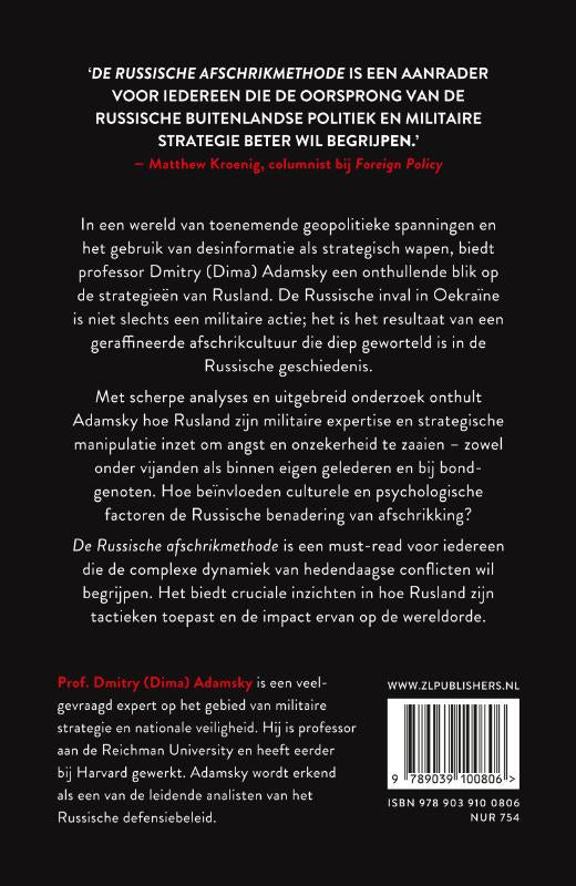 In De Russische afschrikmethode toont Dmitry (Dima) Adamsky, expert op het gebied van militaire strategie en nationale veiligheid, op een toegankelijke wijze Rusland zijn militaire en strategische kundigheid inzet om vriend en vijand af te schrikken en biedt een inkijkje in de historische, culturele en psychologische factoren die deze aanpak zo uniek maken.