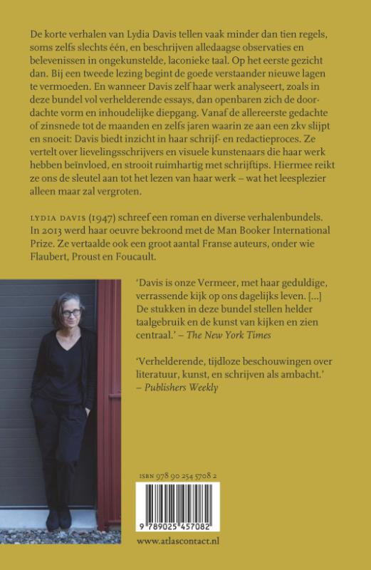 Met ‘De schoonheid van weerbarstig proza’ reikt Lydia Davis ons de sleutel aan tot het lezen van haar werk – wat het leesplezier alleen maar zal vergroten. De korte verhalen van Davis tellen vaak minder dan tien regels, soms zelfs slechts één, en beschrijven alledaagse observaties en belevenissen in ongekunstelde, laconieke taal. Op het eerste gezicht dan. Bij een tweede lezing begint de goede verstaander nieuwe lagen te vermoeden. En wanneer Davis zelf haar werk analyseert, zoals in deze bundel vol verhelderende essays, dan openbaren zich de doordachte vorm en inhoudelijke diepgang. Vanaf de allereerste gedachte of zinsnede tot de maanden en zelfs jaren waarin ze aan een zkv slijpt en snoeit: Davis biedt inzicht in haar schrijf- en redactieproces. Ze vertelt over lievelingsschrijvers en visuele kunstenaars die haar werk hebben beïnvloed, en strooit ruimhartig met schrijftips.