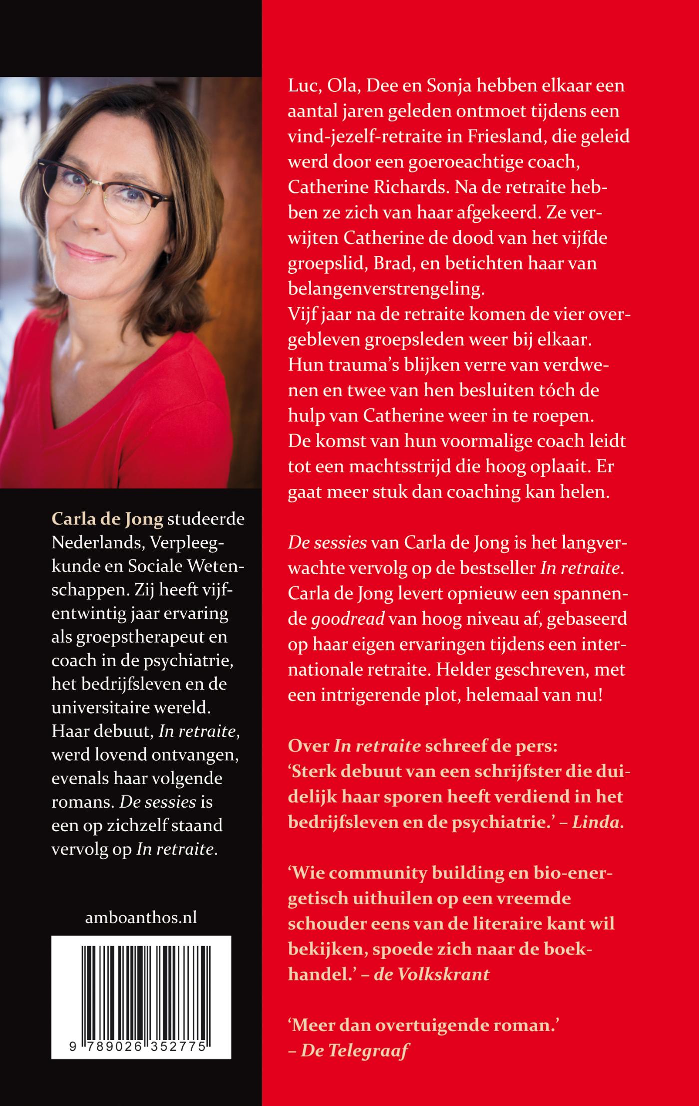 'Verandering tot stand brengen bij gekwetste mensen is een stroperig proces. Dat beschrijven in romanvorm geen sinecure. Het is De Jongs verdienste dat De sessies driehonderd bladzijden lang boeit.' – De Telegraaf