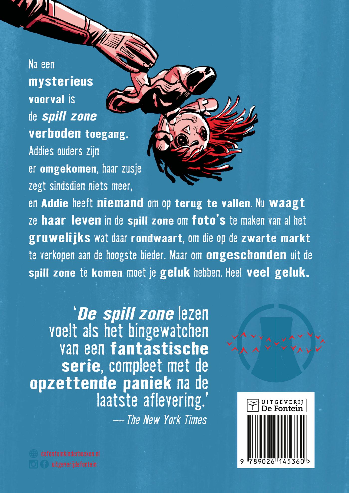 Despill zone is verboden toegang. Na een mysterieus ongeluk zijn de hele stad en de wegen ernaartoe afgesloten. Maddies ouders zijn er omgekomen, haar zusje zegt sindsdien niets meer, en Maddie heeft niemand om op terug te vallen. En dus waagt ze haar leven in de spill zone om foto’s te maken van al het gruwelijks wat daar rondwaart, om die op de zwarte markt te verkopen aan de hoogste bieder. Maar om ongeschonden uit de spill zone te komen moet je geluk hebben. Heel veel geluk.